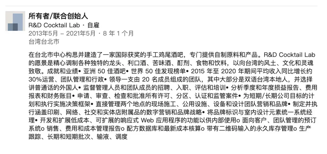 在课程结束后,Spencer并没有飞回美国,那时已经上市的英伟达正发展得如火如荼,而是选择了留在台湾,并与朋友合资开了一家酒吧——R&D Cocktail Lab。与此同时,他也曾在台北另一家酒吧Ounce Speakeasy 当过1年调酒师; 2018年还曾做过一年的 自由摄影师。
