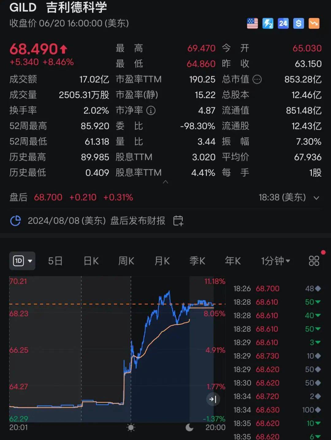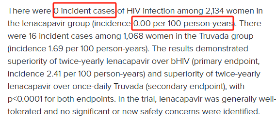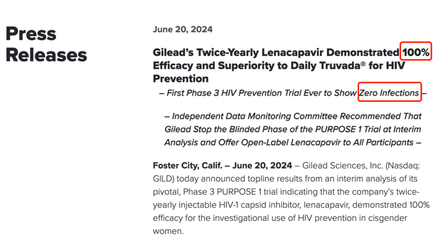 当地时间周四(6月20日),美国生物制药公司吉利德科学在其官网公布一则重磅实验结果,其研发的“Lenacapavir”(来那卡帕韦)在预防艾滋病毒方面显示出了100%的有效性。 图片来源:吉利德科学官网 最新公布结果的是一项名为“PURPOSE 1”的3期双盲随机研究试验,旨在评估Lenacapavir和Descovy对南非25个站点和乌干达3个站点的5300多名16-25岁女性的安全性和有效性。 5300多名受试者按照2:2:1的比例随机分配接受Lenacapavir、Descovy和Truvada用于HIV暴露前预防(PrEP)。 据了解,Descovy、Truvada是每日一次的口服药;Lenacapavir则是一款衣壳抑制剂,每半年一针,通过皮下注射。 结果显示,在Lenacapavir组2134名女性中,HIV感染病例为0例。 来源:吉利德科学新闻稿 而在Truvada组1068名中,HIV感染病例为16例,发病率为1.69例/100人;Descovy组2136名中有39例发病病例,发病率为2.02例/100人。 吉利德科学官网称,这是其具有里程碑意义的PURPOSE项目产生的首批数据,该项目是有史以来最全面、最多样化的艾滋病预防试验项目。 吉利德全球首席医疗官Merdad Parsey写道,一年两针的Lenacapavir具有零感染率和100%的疗效,这证明了其作为预防HIV感染的重要新工具的潜力。 Parsey称,“我们期待正在进行的PURPOSE临床计划取得更多成果,继续朝着我们的目标迈进,帮助世界各地的每个人终结HIV疫情。” 南非开普敦大学德斯蒙德图图艾滋病中心主任Linda-Gail Bekker在新闻稿中表示,“如果获得批准,Lenacapavir将为艾滋病预防提供一种重要的新选择,让全世界许多人都能从PrEP(艾滋病暴露前的预防性用药)药物中受益,尤其是女性。” Bekker是国际艾滋病协会前主席,她指出,传统的艾滋病预防方法也非常有效,但每日一次服用可能会让一些人面临被歧视的风险。 值得一提的是,据CNBC报道,在寻求美国食品药品监督管理局的批准之前,吉利德还需要复现这些结果。该公司预计将在今年晚些时候或明年初分享正在进行的第三阶段研究的数据,这一阶段的研究针对的是有同性性行为的男性。如果这些结果积极,公司最早可以在2025年底将lenacapavir用于PrEP上市。 十多年前,吉利德的Truvada成为首个获批的PrEP,适用于那些没有HIV但有高风险感染的人群。这款日服药片主导了PrEP市场,但现在制药商正在专注于开发作用时间更长的注射剂。 RBC资本市场分析师布莱恩·亚伯拉罕斯预计,吉利德的注射剂将显著增加对预防性HIV药物感兴趣的人数。他估计峰值销售额接近20亿美元。吉利德较新的PrEP口服药“Descovy”,去年实现了约20亿美元的收入。 二级市场上,美股周四收盘,吉利德科学(GILD)大涨8.46%,报68.49美元,市值一夜大涨66.54亿美元(约合人民币483亿元),最新为853.28亿美元(约合人民币6195.19亿元)。 声明:文章内容和数据仅供参考,不构成投资建议。投资者据此操作,风险自担。 编辑|程鹏 杜恒峰 校对|刘小英 封面图片来源:视觉中国(资料图)