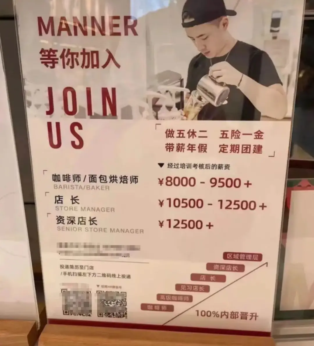 之前曾有报道称,Manner咖啡师的工资在同类连锁品牌中属于较高的一档。 在官方的招聘标准中,给出的薪资是8000-12500元。