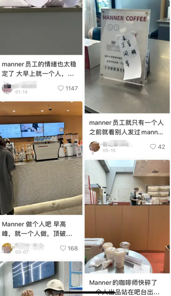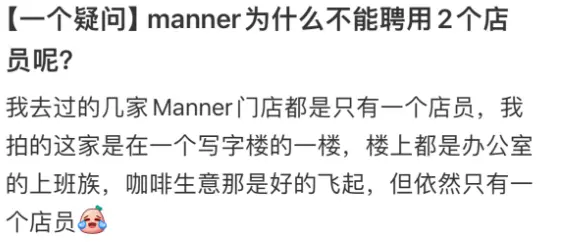 而随着今天各种媒体对Manner管理模式的深入报道,前员工也纷纷现身吐槽。 大家渐渐发现,相比于探讨店员顾客“谁对谁错”,Manner对门店和员工的高压管理才是应该被关注的重点。 这家诞生于上海的连锁咖啡店,近两年来口碑和生意蒸蒸日常,被认为是新消费渐冷的趋势下逆势而上的绝佳品牌案例。 但同时,店员的工作强度也让人闻风丧胆。 在社交网站上随便一搜,会发现很多人都曾吐槽Manner“一家店只配一个店员”是常态。 到店顾客动辄为一杯咖啡等上20多分钟,但看着忙到团团转的咖啡师,又实在觉得催不出口。
