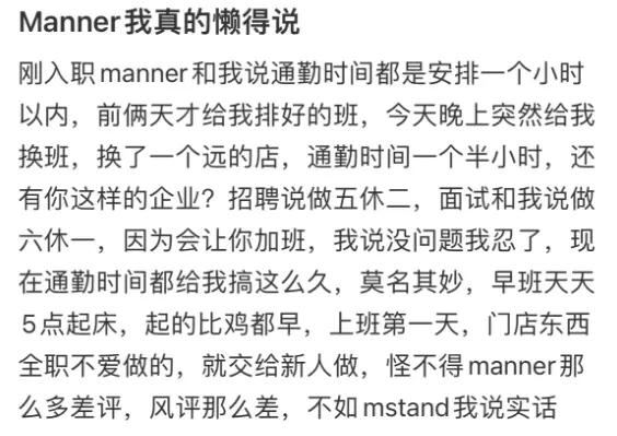讽刺的是,Manner对咖啡产品强调“精品”,但在公司的管理上却又回到了跟连锁同行们一样的“效率至上”。 就像要求刺绣工人们既要绣出手工的细腻,又要有机器的速度。 今天有媒体采访业内人士得知,总部经常会对店内监控进行人脸AI视频稽查。如果发现店员缺失了某道流程,要检讨并扣工资。 就连规定员工上厕所时间的大厂,看到都得感慨一声“牛”。 公司统筹后安排员工加班换班,甚至换门店的情况也很常见。 有前兼职员工吐槽,入职时明明承诺给自己安排路程一小时之内的门店,结果某天突然被换班到更远的店,通勤时间变成了一个半小时。