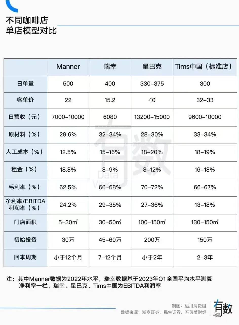 二就是通过人力成本的控制。 根据2022年的数据,Manner的人工成本仅占12.5%,小于瑞幸、星巴克和Tims。