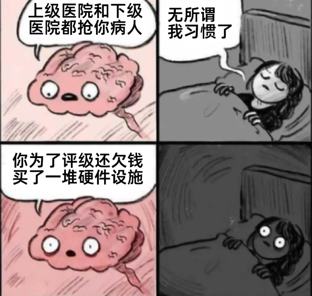 更雪上加霜的是,近年来不少这类医院出于评级要求,跟风完成大量硬件建设,欠下了大量贷款,导致经营负担加剧,再次降低医务人员绩效收入分配。