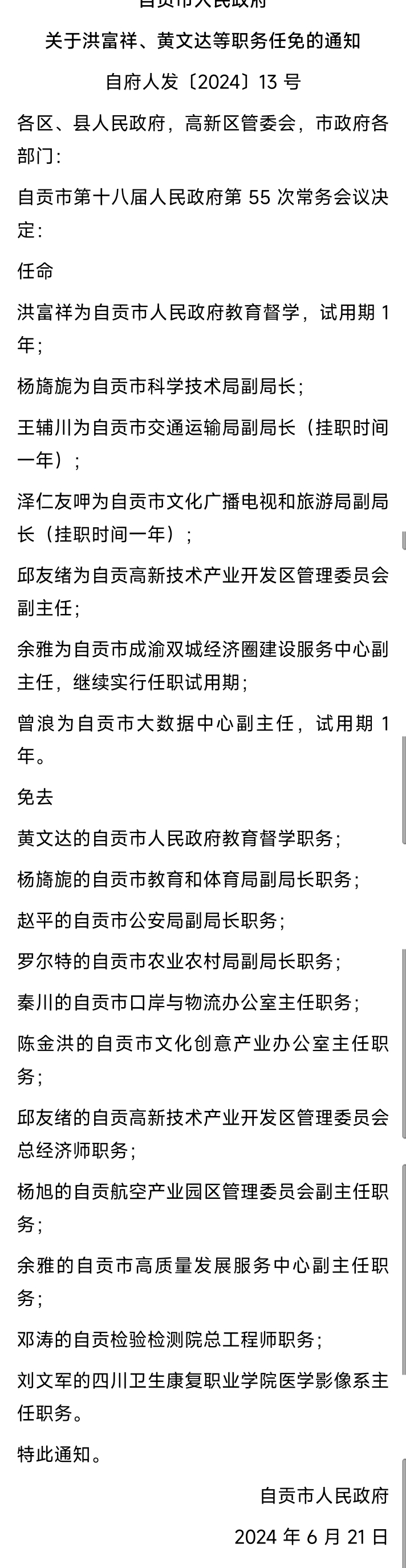 [盐都杂谈] 自贡市人民政府关于洪富祥 黄文达等职务任免的通知