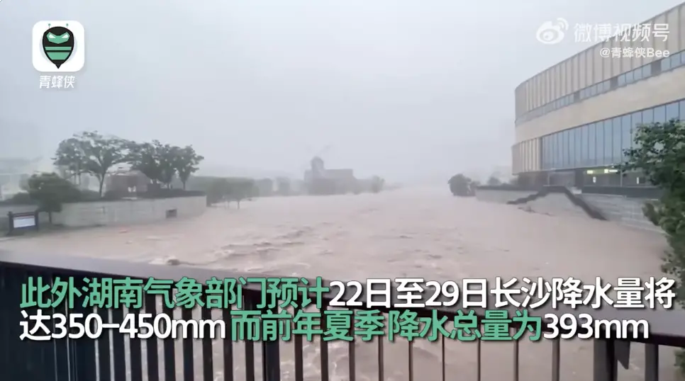 据中国青年报,24日9时到10时长沙降水量达65.1毫米,打破6月单小时降水记录。若根据长沙市总面积11819平方公里计算,单小时总降水量达7.68亿立方米,约为54个西湖。此外,湖南气象部门预计,22日至29日长沙降水量将达350-450mm,而前年夏季降水总量为393mm。气象部门预测,本轮降雨综合强度与2017年6月23日至7月2日的“特强级”暴雨过程基本相当,极端性强。
