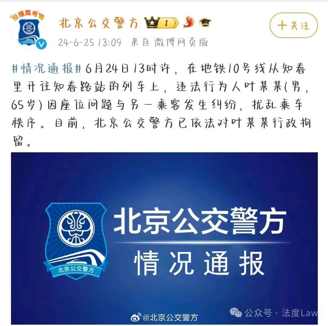 6月25日,北京公交警方就“老人用拐杖袭扰未让座女孩”一事发布《情况通报》。 《情况通报》显示,6月24日13时许,在地铁10号线从知春里开往知春路站的列车上,违法行为人叶某某(男,65岁) 因座位问题与另一乘客发生纠纷,扰乱乘车秩序。目前,北京公交警方已依法对叶某某行政拘留。