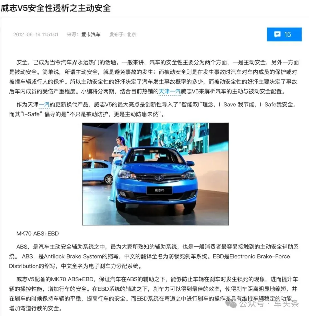 例如,早在2012年6月,天津一汽生产的威志V5汽车就已经宣传主动安全配置。