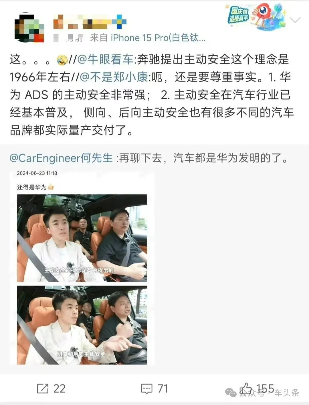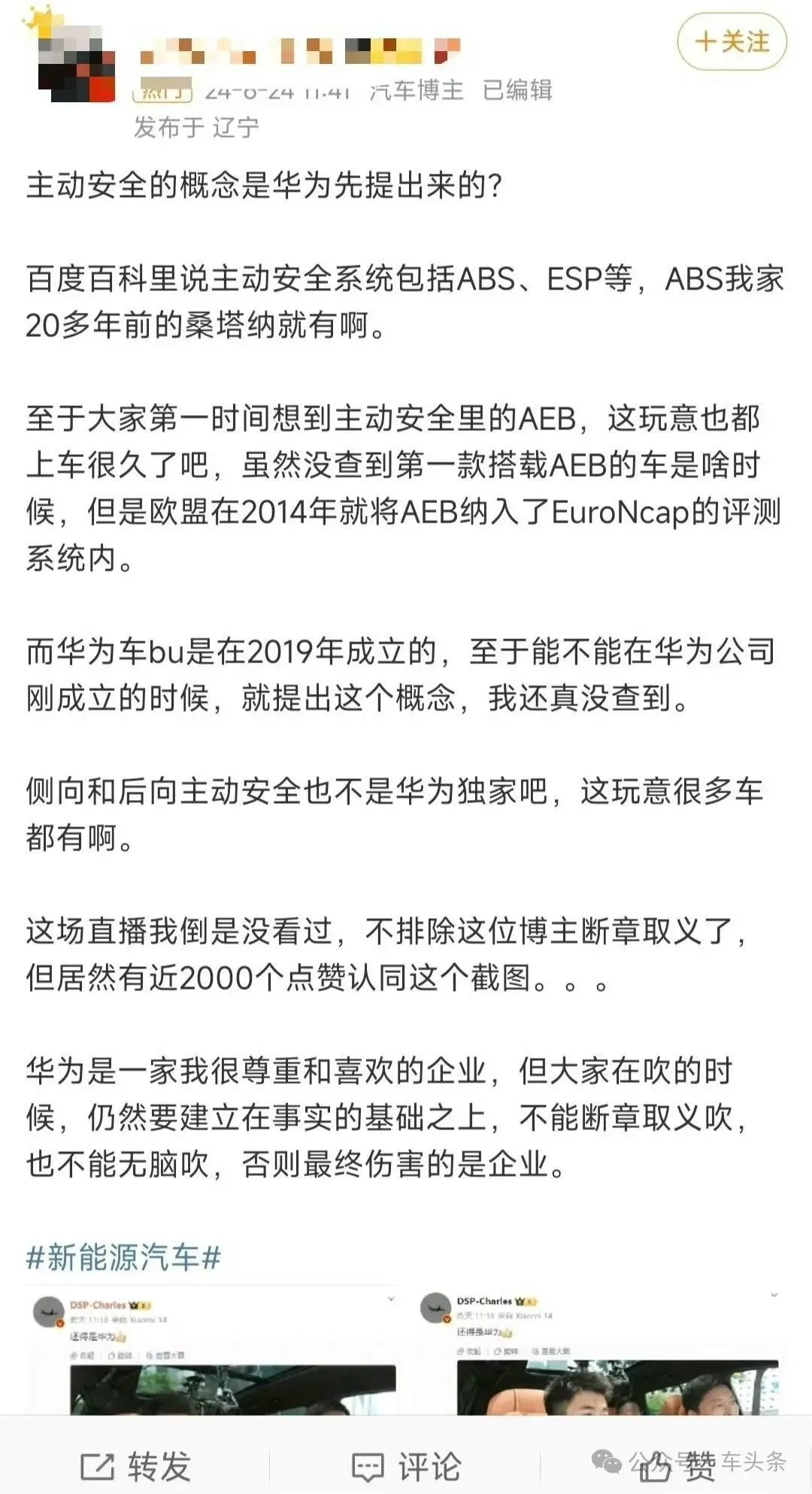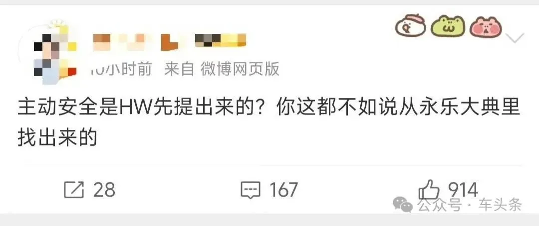 这些博主以及网友的批评言论虽然不乏有些过激用词,但是也都表达了同一个核心,即华为不是第一个提出主动安全概念的公司。