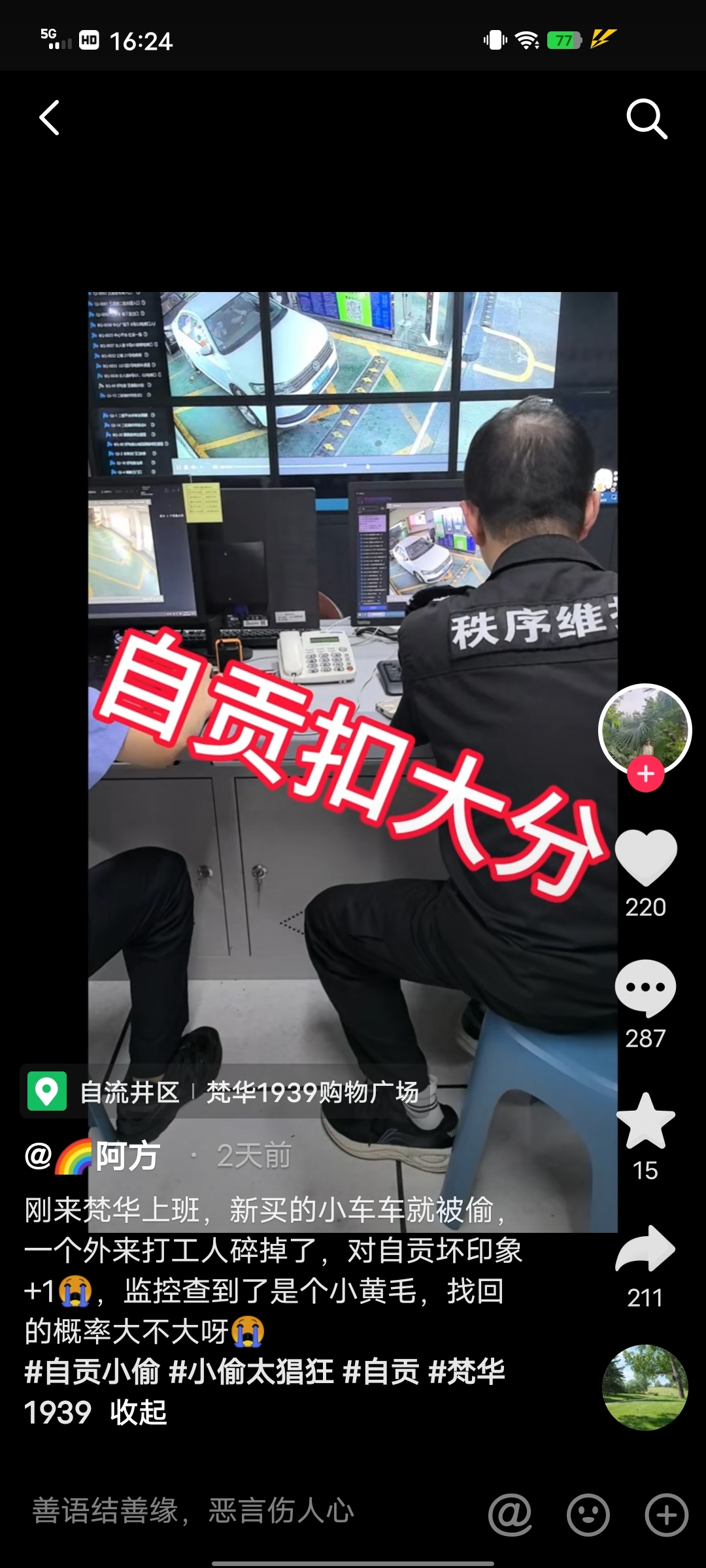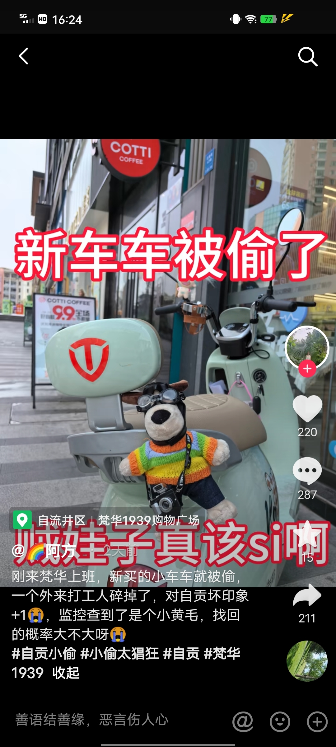 外地人来自贡打工,刚到梵华上班,新买的电瓶车就被偷了,监控查到了是个小黄毛