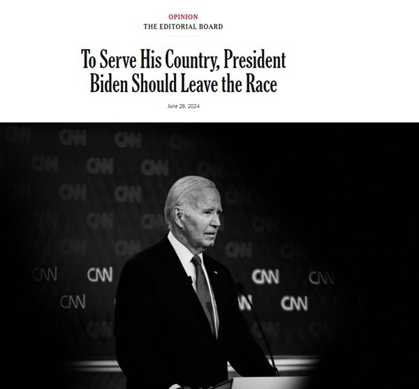包括《纽约时报》《纽约客》在内的亲民主党自由派媒体率先开炮,呼吁拜登为了美国而退出今年的总统大选。《华盛顿邮报》没有直接要求拜登退选,但敦促这位81岁的总统“自我反省”。