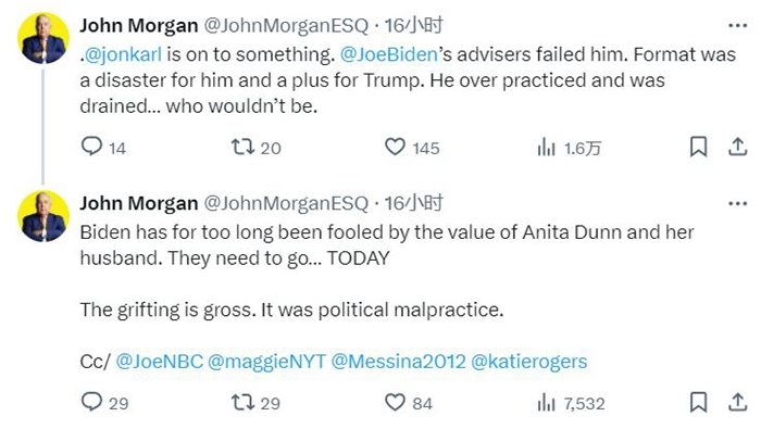 民主党大金主约翰·摩根直接在X平台发文,点名拜登的三名顾问罗恩·克莱恩、安妮塔·邓恩和鲍勃·鲍尔,指责邓恩和鲍尔夫妇长期欺骗拜登,应该立刻被开除。