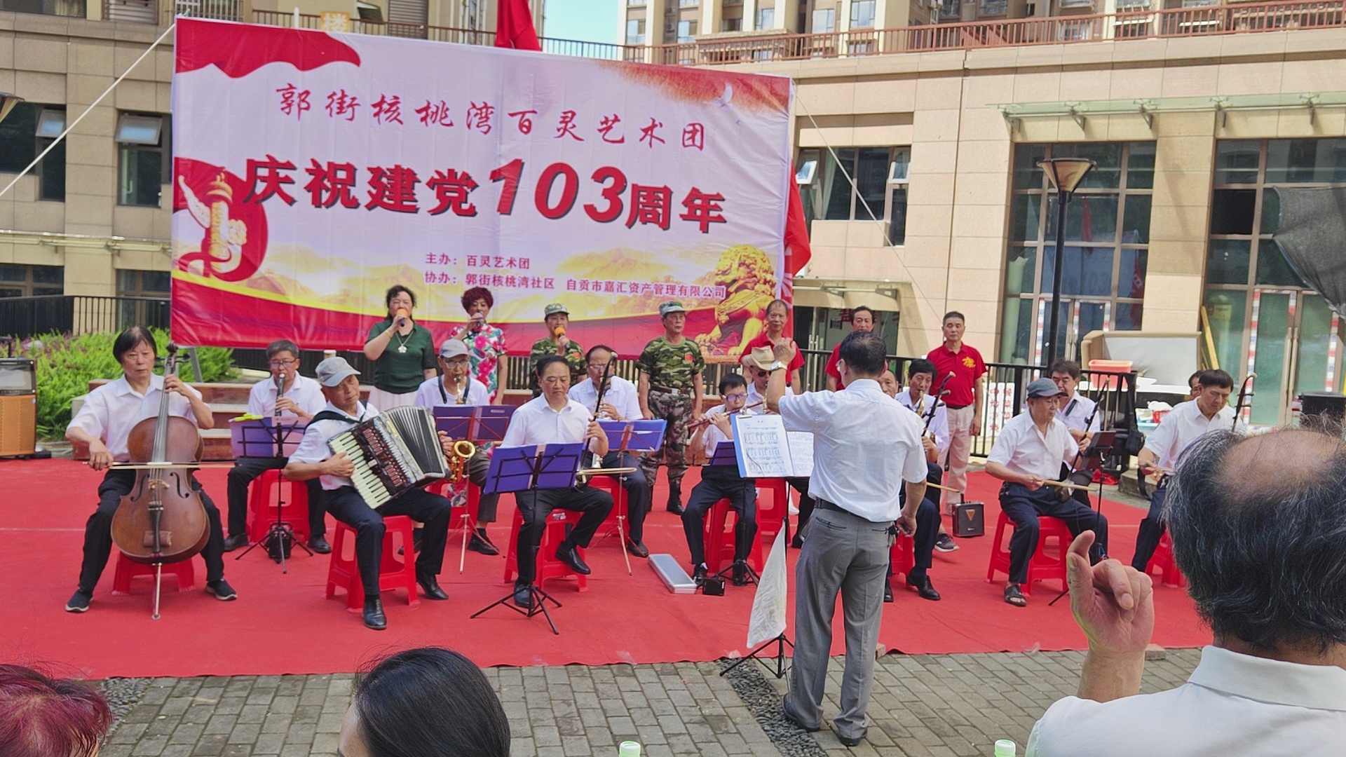 七.一建党103周年庆祝活动,在郭街核桃湾社区和顺家园小区隆重举行,百灵艺术团管弦乐队演出,器乐合奏:《藏歌联唱》,指挥:王世伟  伴唱:王 卫  熊卫兵  王  莉   陈建明  熊 勇  冯 昶  陈玉森。特别是王 伟的笛子独奏很受观众欢迎,自媒体.自由撰稿人郭老者现埸摄像编辑,并在各大网络平台发佈,欢迎大家关注。