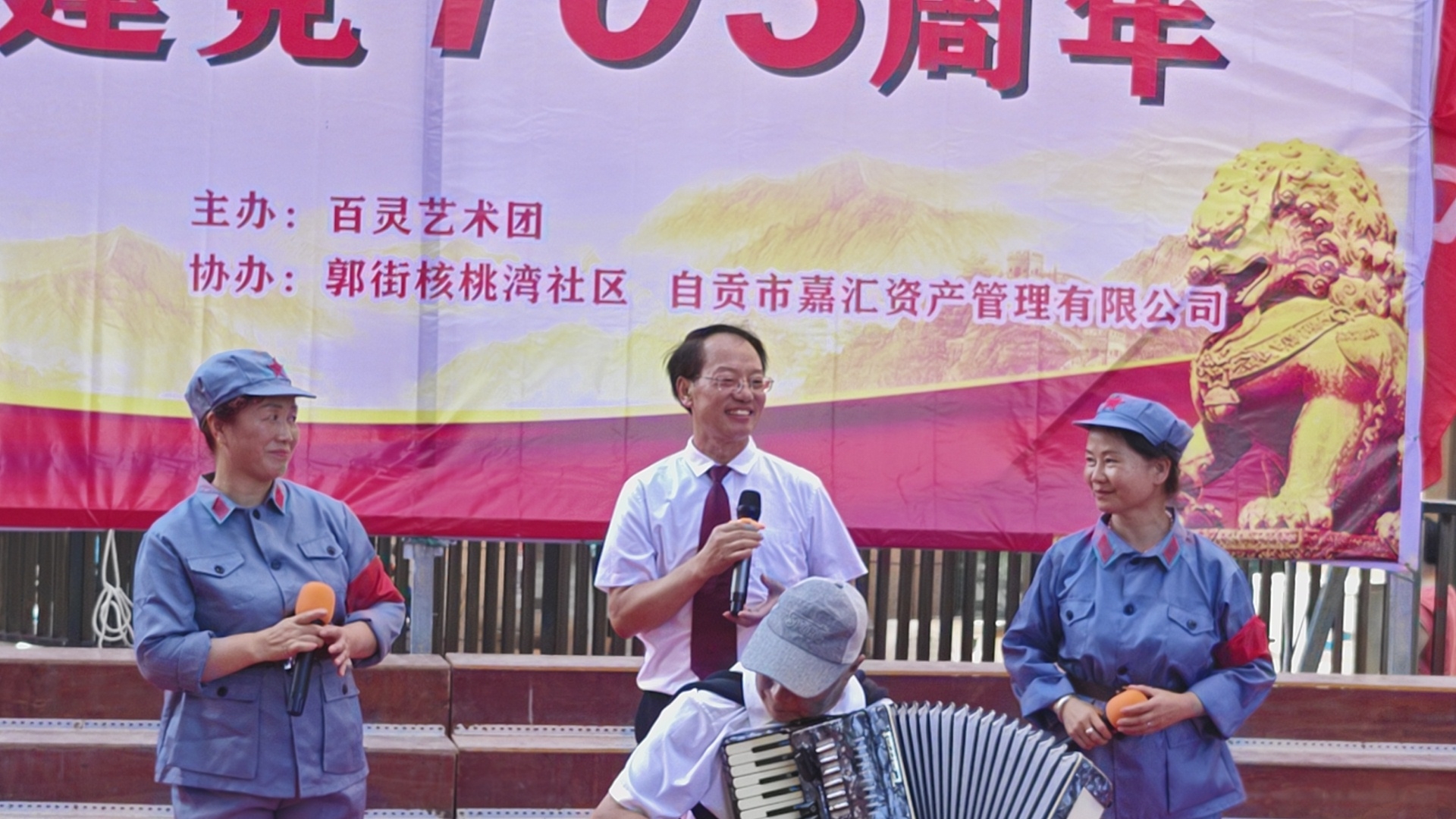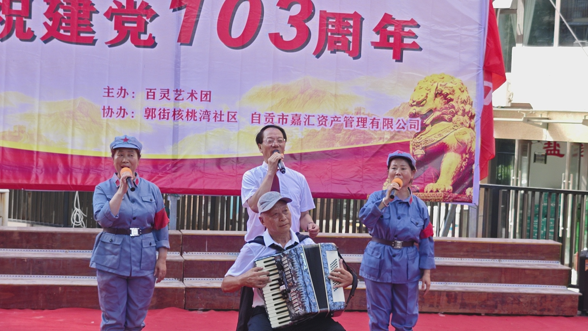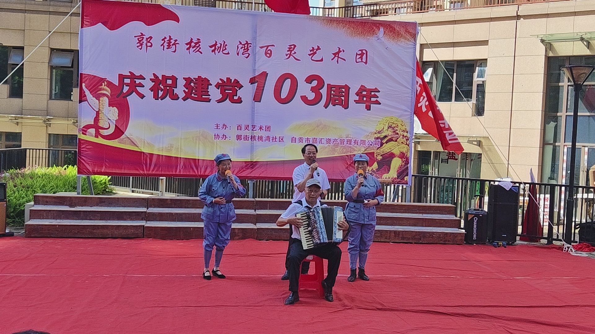 七.一建党103周年庆祝活动,在郭街核桃塆社区和顺家园小区隆重举行,百灵艺术团主办这埸庆典活动,还组织了精彩的文艺节目演出,蔡秉厚演出的手风琴独奏《我和我的祖国》,伴唱城池等人伴唱效果很好,得到观众好评,蔡秉厚是文艺高手,为百灵艺术团团歌作曲,很受大家欢迎,自媒体.自由撰稿人郭老者现埸摄像编辑,并在各大网络平台发佈,欢迎大家关注。