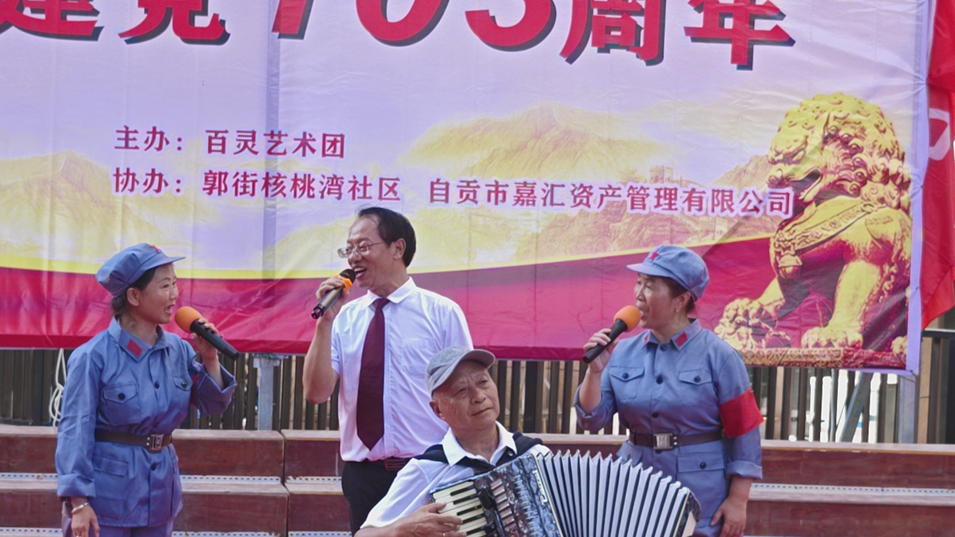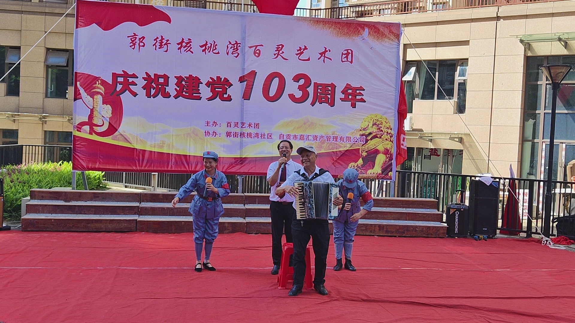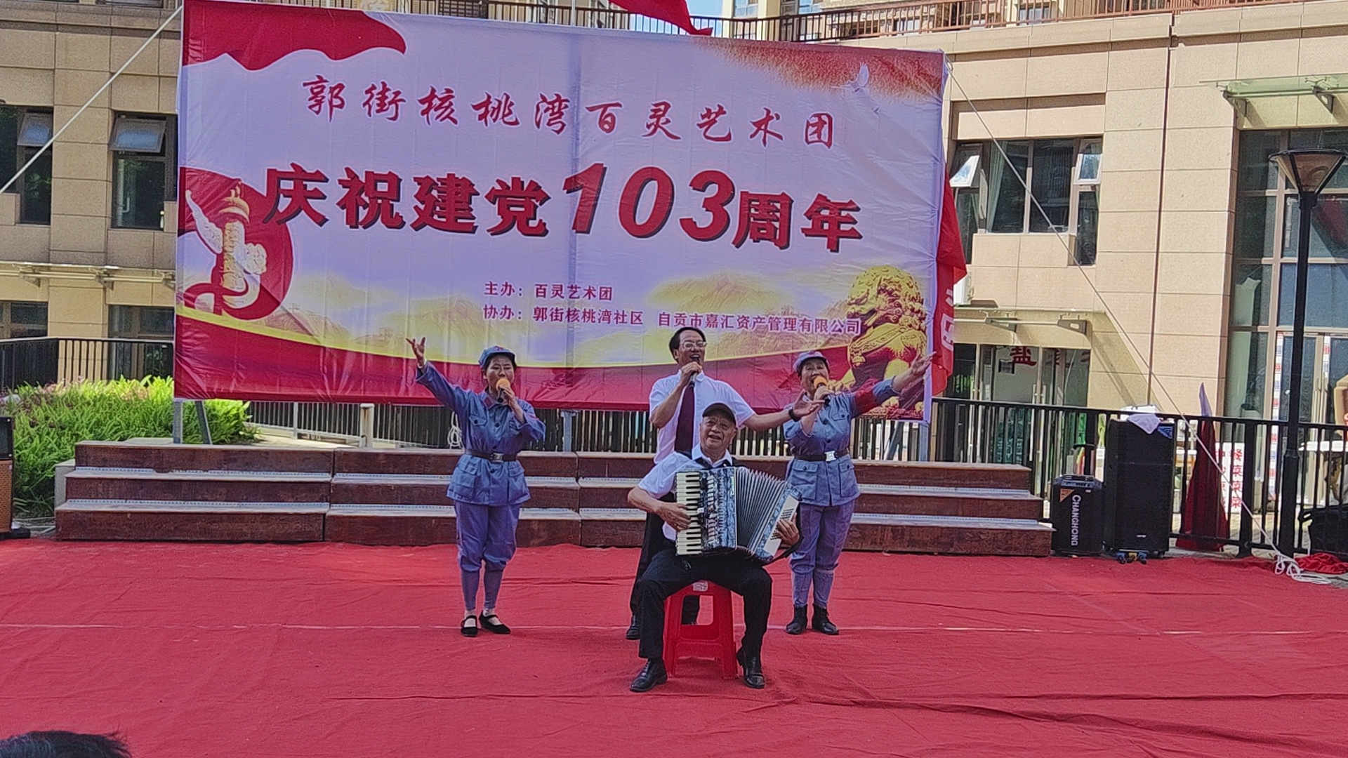 七.一建党103周年庆祝活动,在郭街核桃塆社区和顺家园小区隆重举行,百灵艺术团主办这埸庆典活动,还组织了精彩的文艺节目演出,蔡秉厚演出的手风琴独奏《我和我的祖国》,伴唱城池等人伴唱效果很好,得到观众好评,蔡秉厚是文艺高手,为百灵艺术团团歌作曲,很受大家欢迎,自媒体.自由撰稿人郭老者现埸摄像编辑,并在各大网络平台发佈,欢迎大家关注。