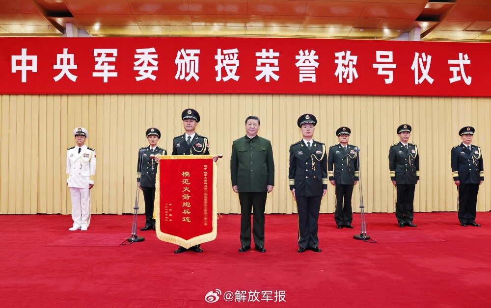 中央军委举行荣誉称号颁授仪式 习近平向获得荣誉称号的单位颁授奖旗