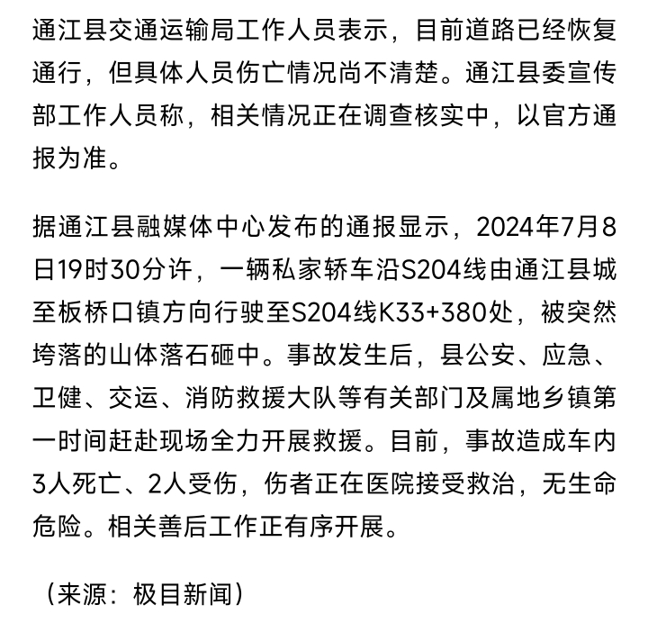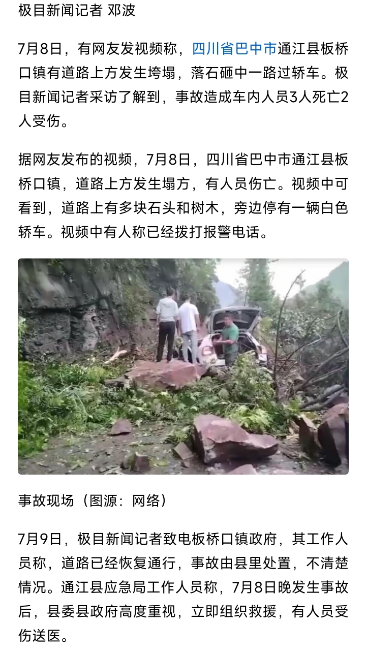 [盐都杂谈] 巴中通江县一私家车被山体落石砸中 官方:事故造成车内人员3死2伤