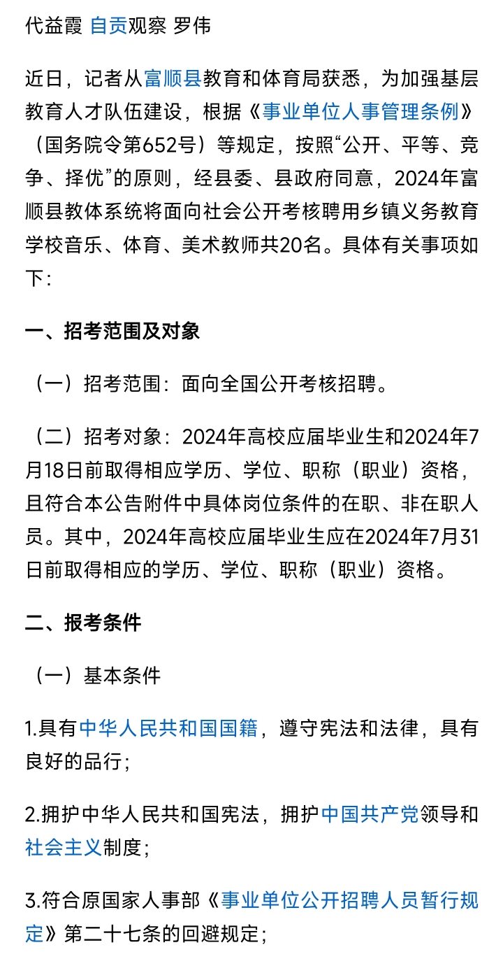 [盐都杂谈] 面向全国!富顺县教体系统公开考核招聘20名教师