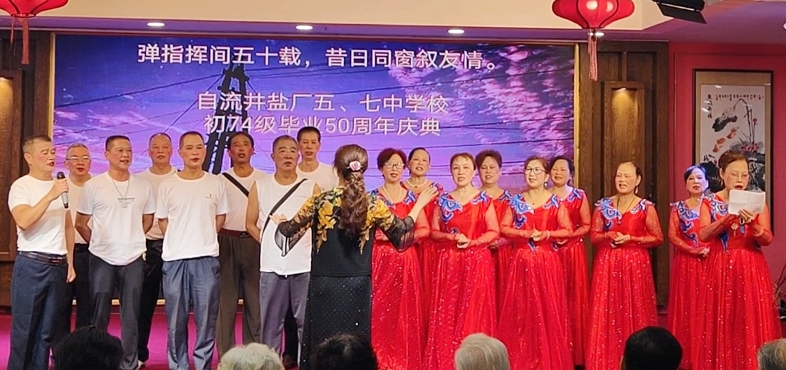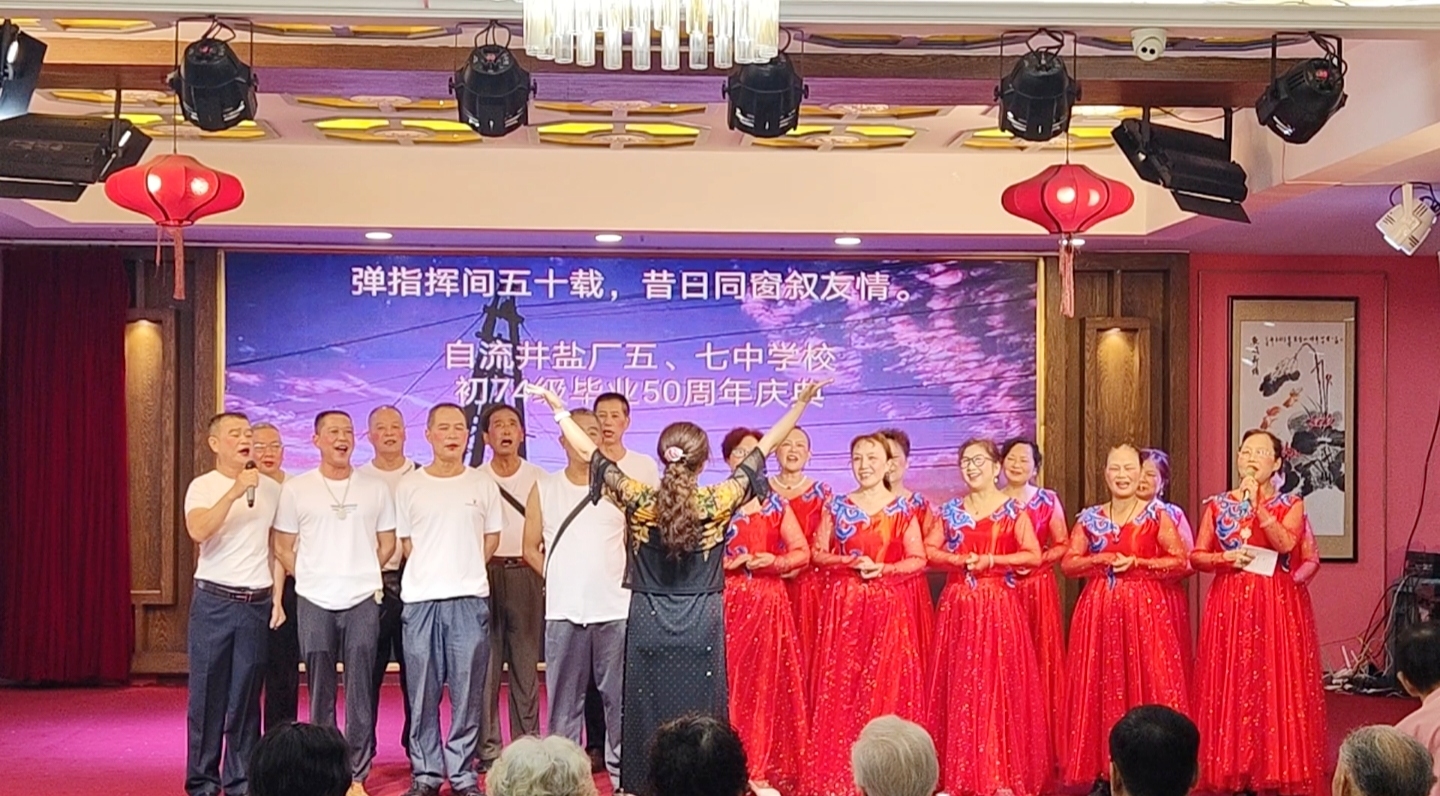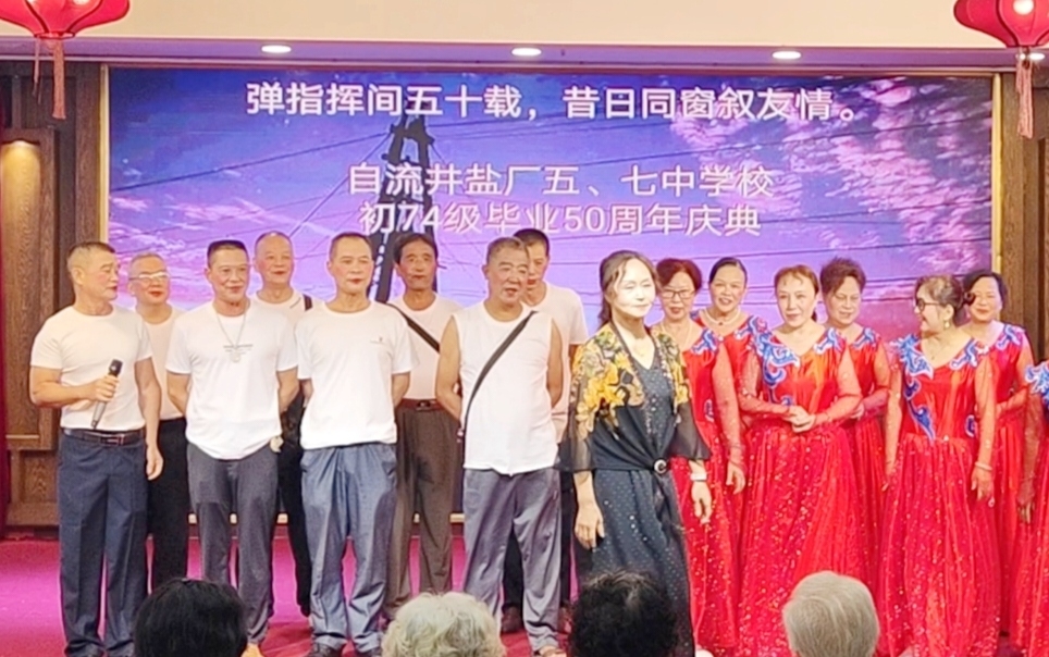 自流井盐厂五.七中学,初74级毕业生,50周年庆典活动在泰丰大厦酒店蜀南晏隆重举行,同学们准备了精彩的文艺节目演出,二班同学们演出小合唱“年青的朋友再相会”,歌声唱出了新时代的最强音,自媒体.自由撰稿人郭老者现埸摄像编辑,并在各大网络平台发佈,欢迎大家关注。