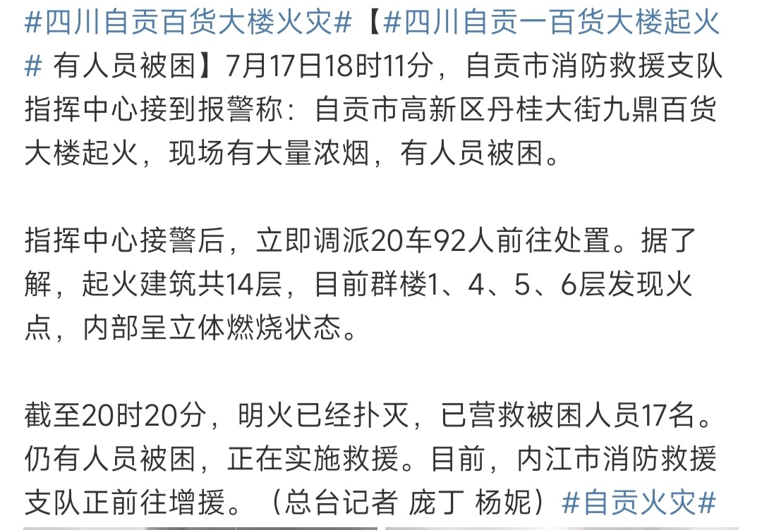 [盐都杂谈] 自贡九鼎百货大楼火灾明火已被扑灭,已救出17人,内江消防前来支援。