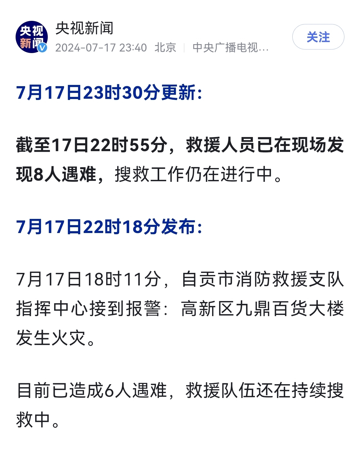 [盐都杂谈] 持续更新丨四川自贡市百货大楼火灾已造成8人遇难 搜救仍在持续中