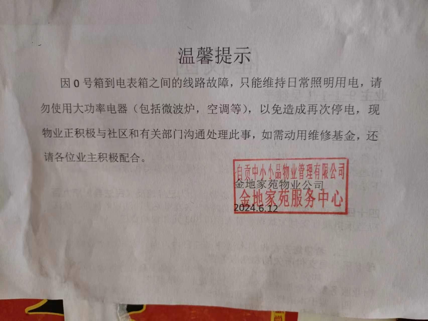 2. 请求市政府协调电力公司和物业公司,立即采取措施解决小区的用电问题,包括但不限于临时增加供电容量、确保供电的稳定性和安全性。2024年6.12日现物业公司(中小小品物业公司)通知业主:变压器0号箱到电表箱线路出现问题,只能照明,不能使用大功率电器(如微波炉、空调),19栋变压器到19栋6单元0号线之间故障,实际影响居民为19栋4,5,6单元部分居民用。目前时间过去一个月,区各级部门领导只做解释一直没能解决问题。鉴于目前的紧急情况,我们请求市政府能够提供临时的应急措施,以保障小区居民在问题得到彻底解决前的基本用电需求。