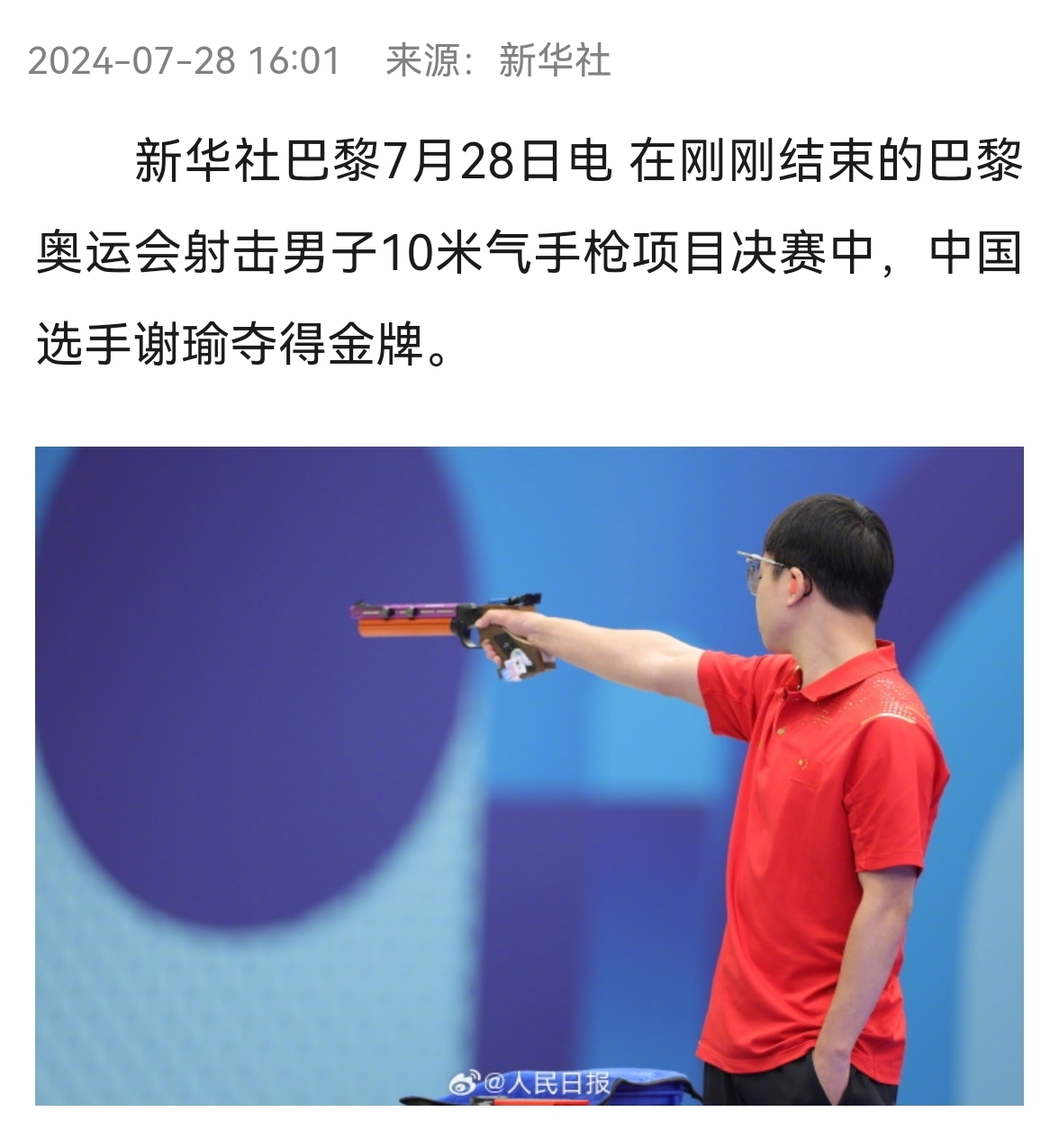 [盐都杂谈] 中国选手谢瑜夺得巴黎奥运会射击男子10米气**冠军