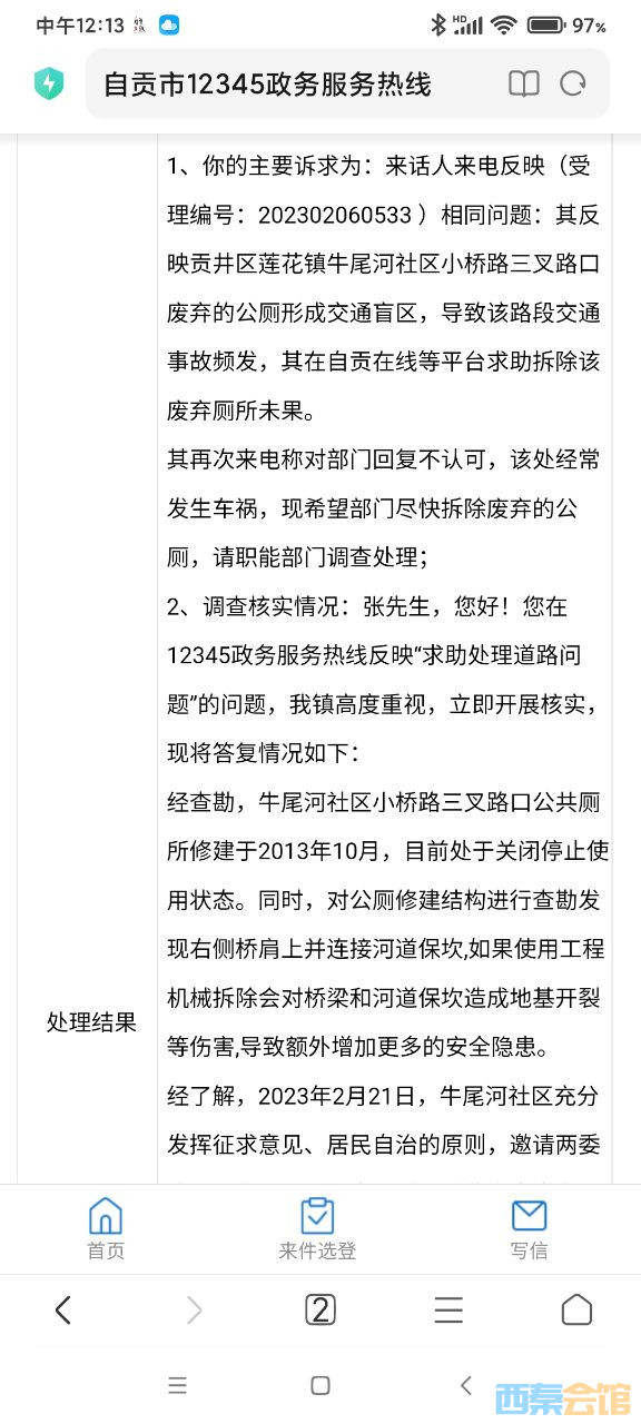 本人也已三次打了自贡贡12345政务服务热线反映了此安全隐患问题,同时在《自贡在线》三次分别以《三叉路口废弃公厕成盲区迟迟未拆除交通事故仍在频发》 《一短陡坡的三叉路口交通事故频发》《短陡坡三叉路口废弃公厕成交通盲区导致交通事故频发》为题爆料。