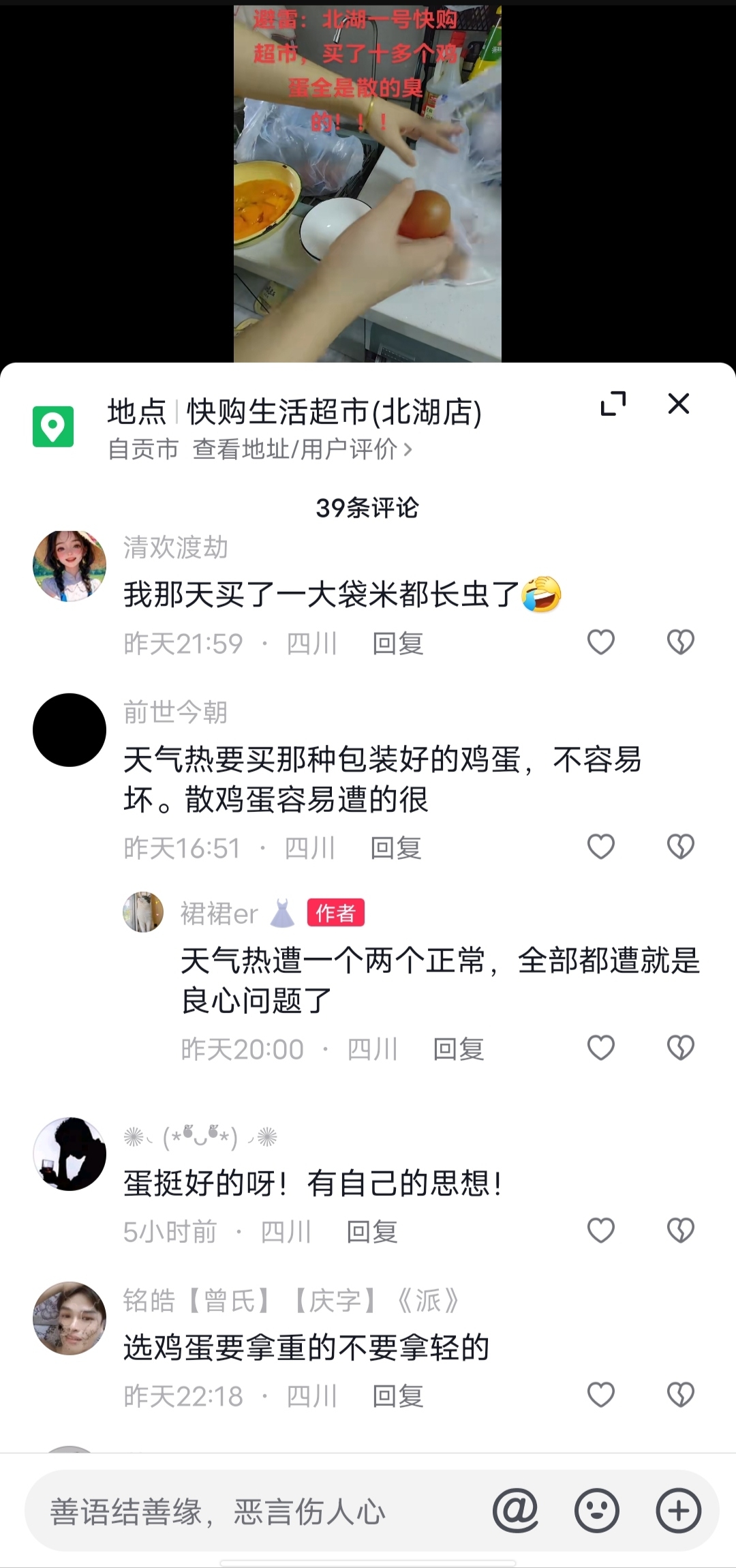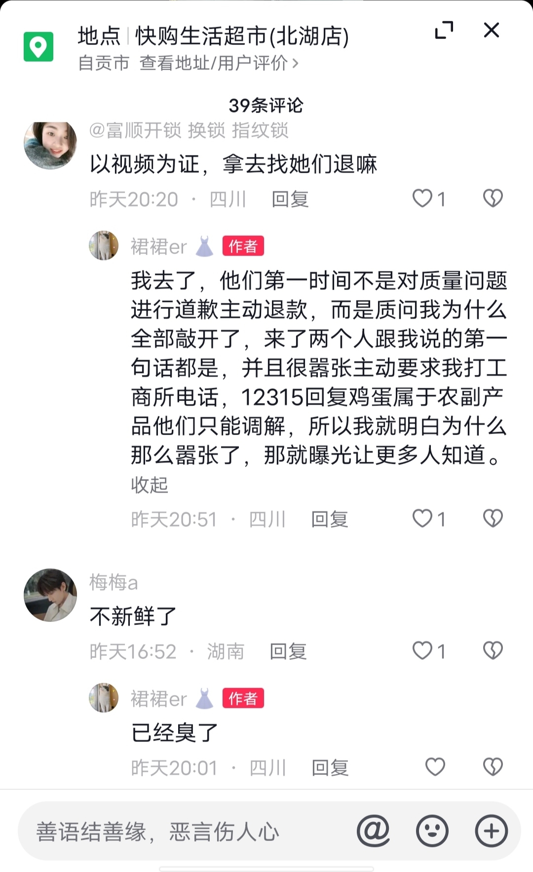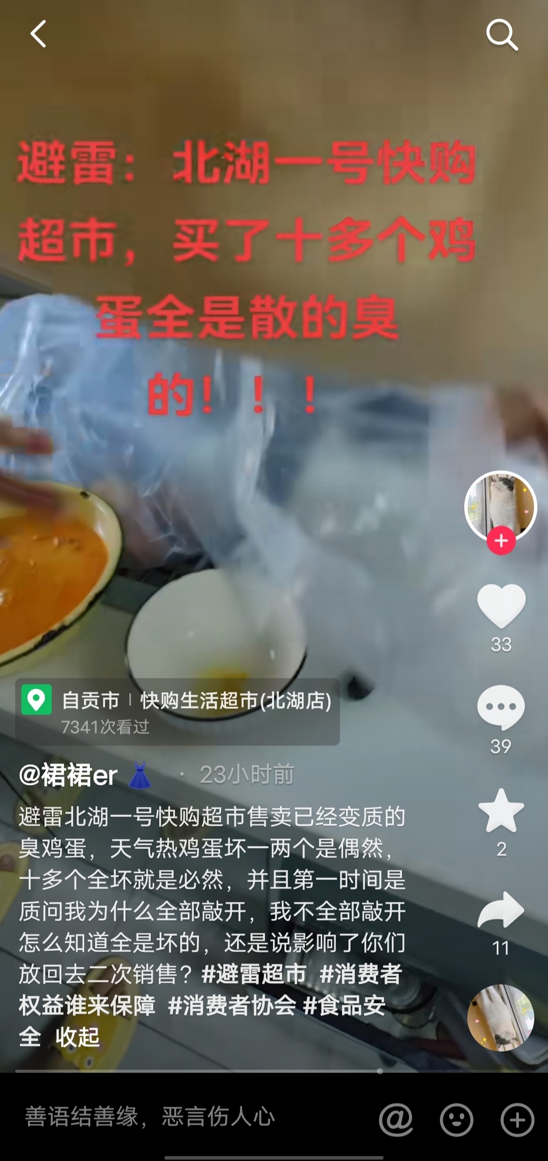 “避雷北湖一号快购超市售卖已经变质的臭鸡蛋,天气热鸡蛋坏一两个是偶然,十多个全坏就是必然,并且第一时间是质问我为什么全部敲开,我不全部敲开怎么知道全是坏的,还是说影响了你们放回去二次销售?#避雷超市 #消费者权益谁来保障 #消费者协会 #食品安全”转自抖音网友裙裙er