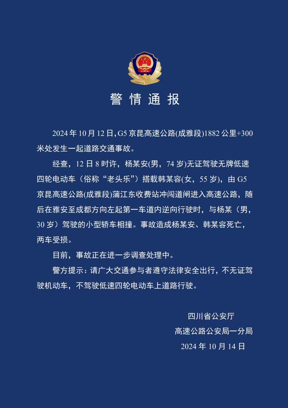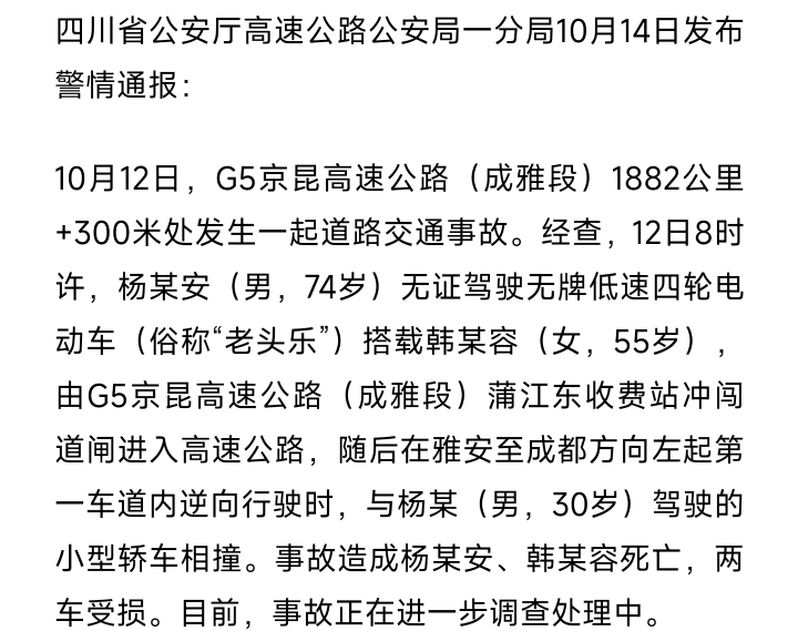 [盐都杂谈] 四川警方通报“老头乐”高速冲卡逆行被撞:2人死亡