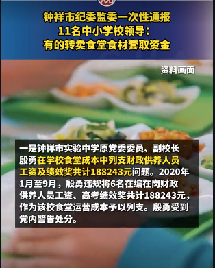 通报称, 2020年1月至9月,钟祥市实验中学原党委委员、副校长殷勇违规将6名在编在岗财政供养人员工资、高考绩效奖共计188243元作为该校食堂运营成本予以列支; 2023年9月至2024年6月,胡集三中党支部书记、校长罗大荣与副校长马德军商议,转卖食堂食材套取资金9000元,用于违规发放教师值班补贴和福利。三是旧口镇罗集小学校长肖仁乙、副校长张永恒、总务主任赵俊向学生摊派费用41055元,用于发放教师津补贴问题;双河小学党支部书记、校长包玉波,总务主任杜国宝通过虚增食堂蔬菜采购数量的方式,套取资金4000元,用于支付该校违规产生的生活招待费;石牌镇小学党支部书记、校长李晓银,副校长肖志华通过提高部分蔬菜供应价格的方式,套取食堂资金8000元,用于支付该校违规产生的生活招待费。