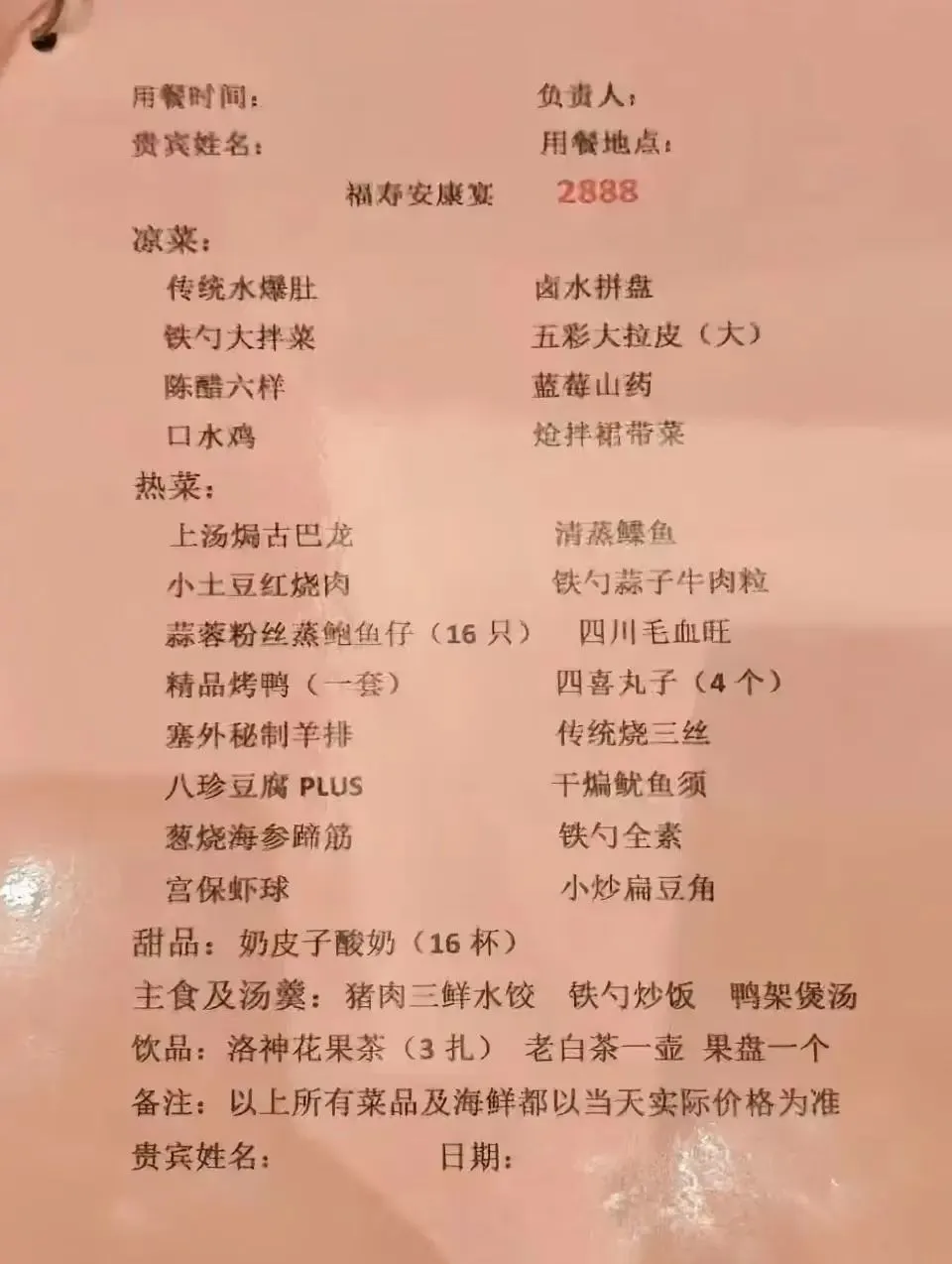 山西某县城过年期间的菜谱,肉菜平均168,过年期间指定菜谱,点一道菜就像看直播,