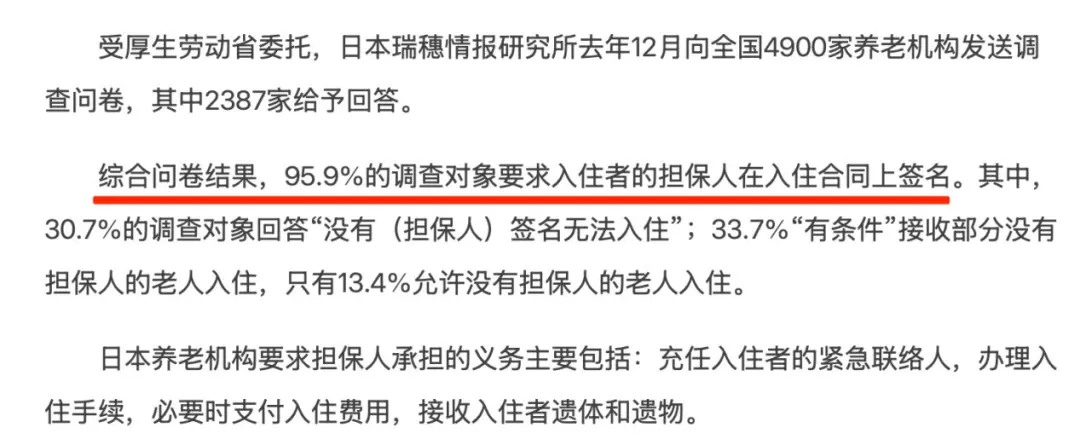 95.9%的养老机构要求入住者的担保人在合同上签名,图源新华网报道《无担保人拒收 日本单身老人养老院“入住难”》