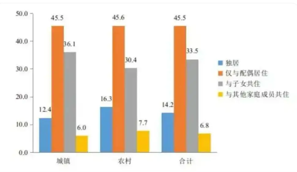 “儿孙绕膝、病榻前都是子女全”的温馨场景,变得不那么常见。《第五次中国城乡老年人生活状况抽样调查基本数据公报》显示,老人与子女同住的比例仅约三成,最常见的情况是与配偶同住,占比高达45.5%。换句话说,近一半的老人,是靠老伴互相照料走过暮年。