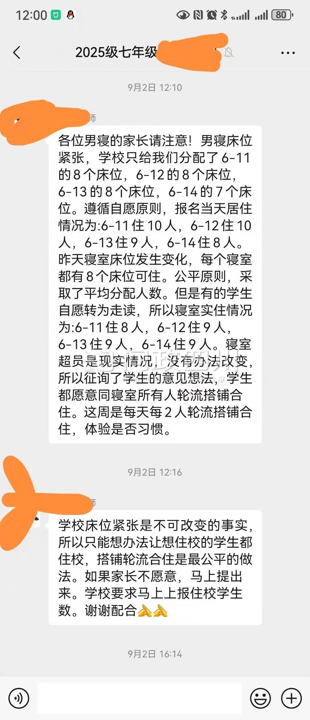 学生提供的班级群聊天截图显示,老师表示,初一男寝床位紧张,学校给班级安排了4个寝室,每个寝室有8个床位,其中有3个寝室住了9人。老师还表示,搭铺轮流合住是最公平的做法,学校正在统计住校人数,家长不愿意可以提出。 根据学生提供的截图,8人宿舍实际入住9人,多出来的1人轮着和别人睡一张1.1米宽的床。 9月30日,西昌月城学校一工作人员告诉极目新闻记者,有学生在问政四川平台反映此事后,学校非常重视,29日晚上就对部分学生进行了安排。该工作人员介绍,学校没有床铺的学生共有10人,他们连夜将宿舍管理员寝室改造为学生宿舍,同时还在其他地方增加了床铺,目前10名同学都已安排单独床位。 【来源:极目新闻】