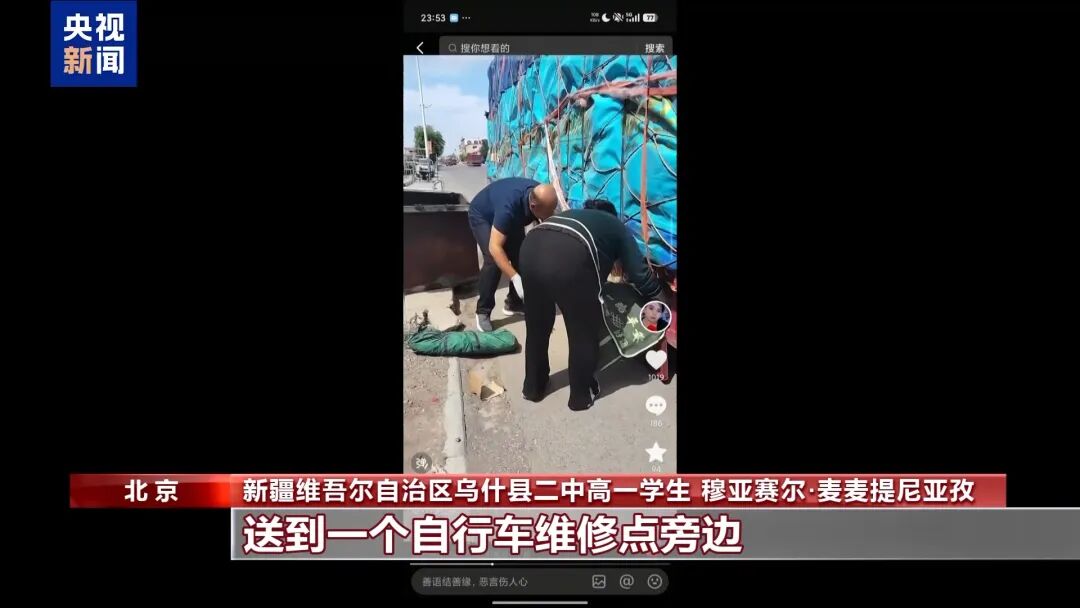 穆亚赛尔·麦麦提尼亚孜:我们自行车后轮爆了,没有备用的,没办法发了个视频求救。新疆的一个叔叔把他的车开过来,把我们的自行车安在上面,送到一个自行车维修店旁边,把我们放下了,然后自己走了。