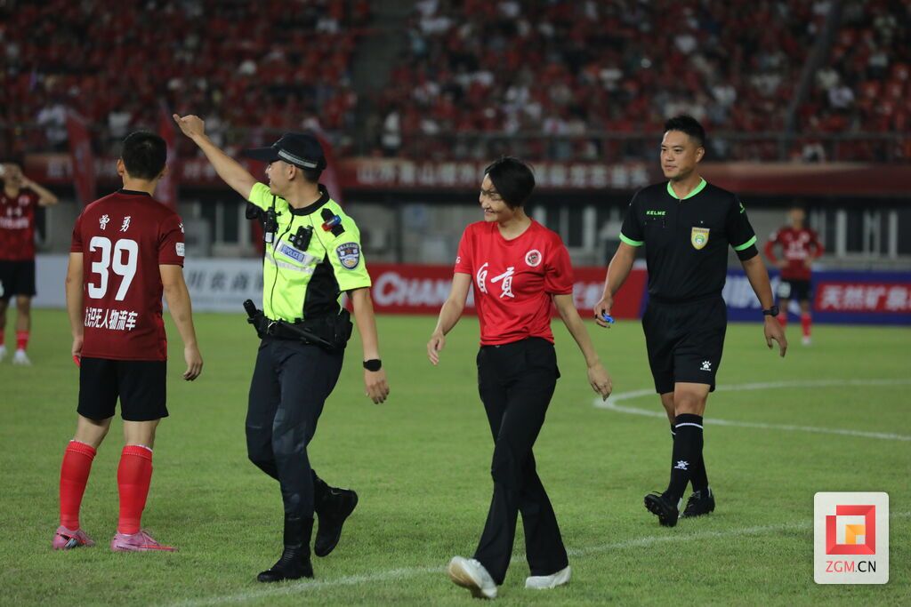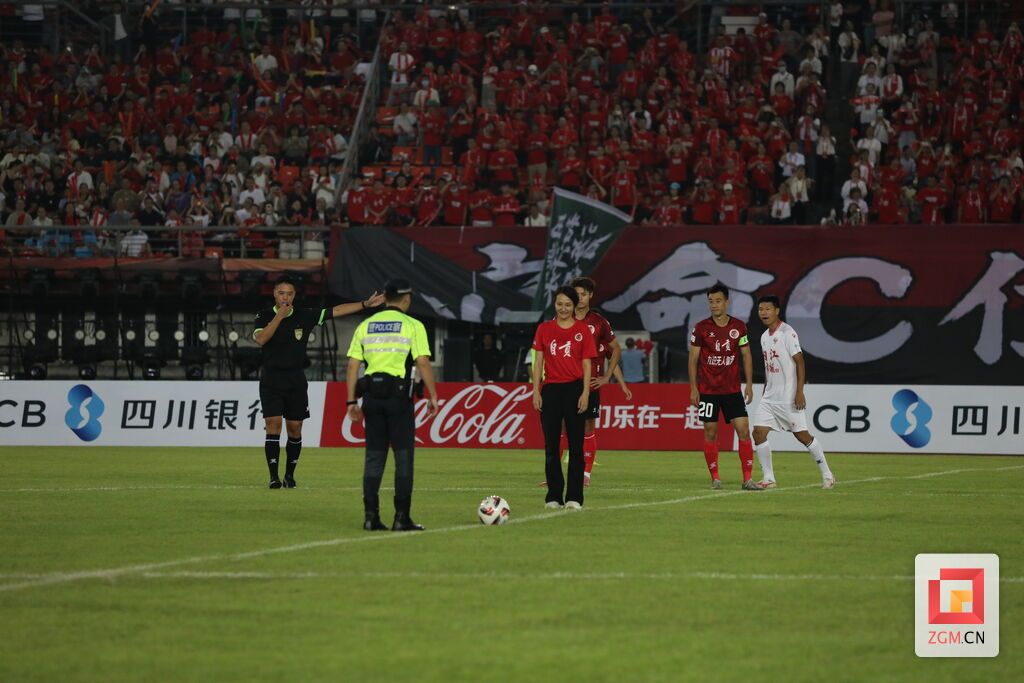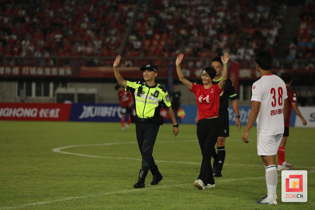 比赛当日虽遇小雨,但丝毫未影响现场氛围。在球迷的热烈欢呼声中,高敏与陈俊来到赛场核心区,携手完成开球仪式。作为从自贡走出的体育传奇,高敏的亮相唤起了家乡球迷的集体记忆;而曾获“魔鬼周勇士”称号、因暖心执法走红网络的交警陈俊,则以“藏蓝守护”的家乡代表身份引发全场共鸣。两人在现场频频向看台挥手致意,与球迷共同高喊“自贡加油”,将赛前气氛推向高潮。