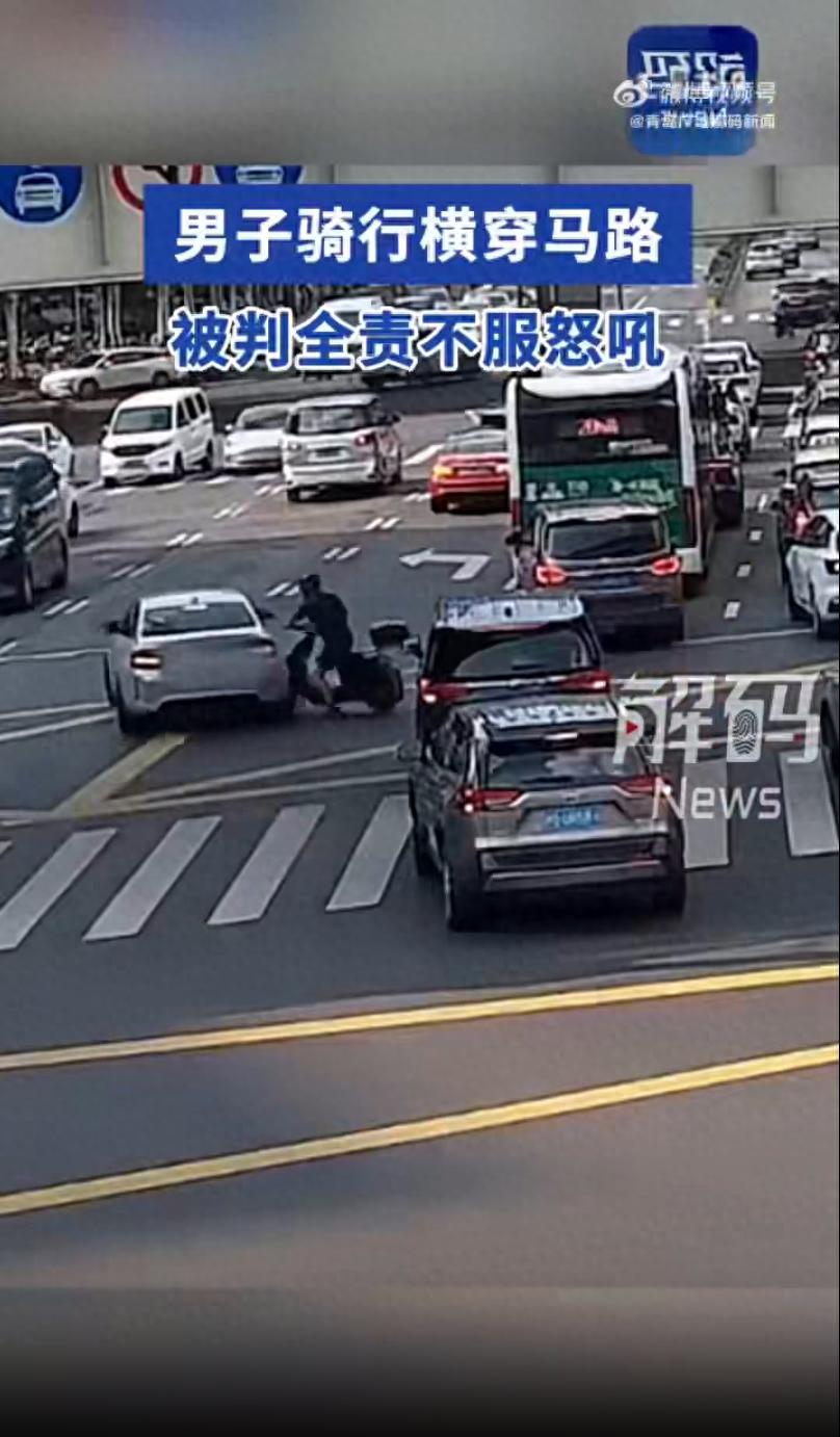 近日,上海一男子骑电动自行车来到路口,从车流间隙中骑行横过机动车道时,撞上内侧车道一辆正常通行的小汽车。监控画面显示,骑车男子与小汽车受外侧车道缓行车辆遮挡,互相均看不到对方,且骑车男子不仅未下车推行,也未先向左观察,而是直接横穿。 交警到场勘查后认定,男子驾驶非机动车横过机动车道未下车推行,负事故全部责任。然而该男子对此大为不满:“看不到我他开什么车呀!”“机动车撞人,肯定他有主要责任!”  “机动车和非机动车本质上有什么区别?你们两个都是从江宁路桥下来,同样都是右转弯车道,正常来讲非机动车应当开在机动车的右边,你是不会从机动车当中穿过去的,最主要你们两个人当中,隔了一辆车,他这里被这辆车挡住看不到,你看过来也看不到他的车,不要老是觉得汽车能看到你,汽车有时候是真看不到你。” 交警根据监控画面以及双方行驶轨迹,详细地向该男子分析其违法行为以及与事故因果关系,最终经半个多小时的耐心普法和教育,该男子终于转变了态度,认可了自己的全责,并在交警调解下现场赔付了小汽车一方的车损。交警提醒:驾驶自行车、电动自行车、三轮车在路段上横过机动车道,应当下车推行,有人行横道或者行人过街设施的,应当从人行横道或者行人过街设施通过;没有人行横道、没有行人过街设施或者不便使用行人过街设施的,在确认安全后直行通过。 (来源:青岛广电解码新闻 )