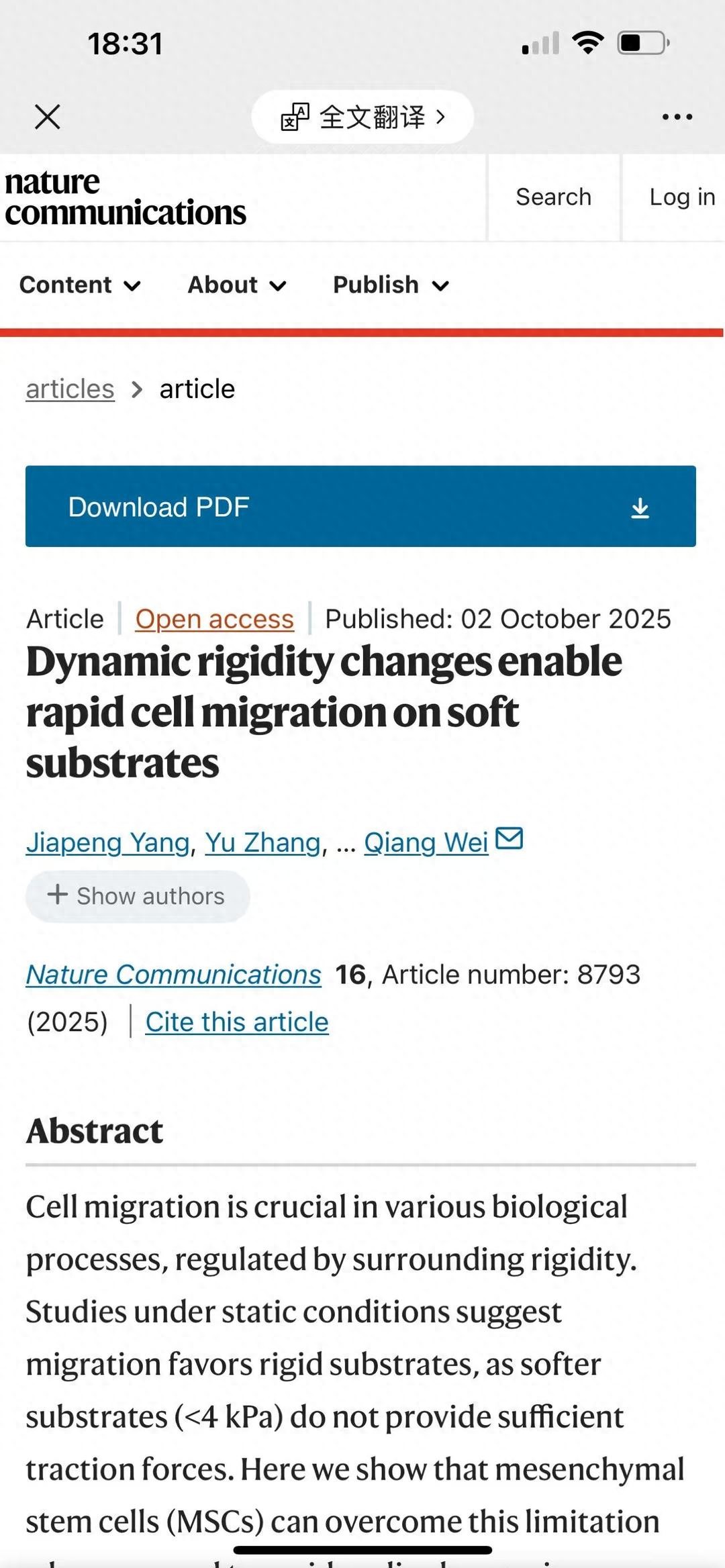 最新研究颠覆了这一认知。10月2日,红星新闻记者从四川大学获悉,近日,南京大学曹毅教授、四川大学魏强教授,以及济南微生态生物医学省实验室顾晓松院士、江春平教授等在Nature Communications发表成果,发现当基底刚度在1.6~2.2千帕之间以1分钟频率快速循环时,细胞迁移速度提升了36倍以上,甚至超过硬基底上的速度。 这种全新迁移模式无需建立前后极性,细胞像“弹簧”一样反复“伸长—回弹”,高效但随机地移动。背后机制是“力失衡”:内部收缩力积累超过外部黏附力,黏着点突然崩解,推动细胞瞬间位移。  页面截图 这不仅揭示了生命对动态环境的巧妙适应,也与社会热点息息相关。它或许解释了癌细胞为何能在病灶周边的动态组织中快速扩散,也为组织修复和再生医学提供了新思路。 “魔法地毯”助力细胞极速狂飙 当“赶路”细胞遇上“善变”地面 想象一下,你在操场上跑步,地面结实又有弹性,你跑得又快又稳。但如果让你在松软的沙滩上奔跑,你会不会觉得特别费劲?这就是科学家们的传统认知:细胞在“硬地”上走得快,在“软地”上走不动。 问题是,我们身体里的很多重要器官,比如肺、肝脏和大脑,本来就是柔软的“沙滩”。细胞每天都在这些地方活动,它们难道真的走不动吗? 这个问题困扰了科学家很多年。直到最近,南京大学曹毅教授、四川大学魏强教授团队及其他合作团队,发明了一种特别的“魔法地毯”——光响应水凝胶。只要打开或者关闭灯光,这块“地毯”就能在“硬”和“软”之间来回切换,就好像操场瞬间变成沙滩,又立刻变回操场。 科学家们让细胞站在这块“魔法地毯”上,观察它们会怎么行动,结果出乎意料:当地毯每隔一分钟就从“硬”变“软”,再从“软”变“硬”时,细胞不但能走,还能以比硬地上更快的速度狂奔。 这些细胞不是像平常那样规规矩矩地往前爬,而是展现出一种全新的“旅行方式”: 它们先把身体慢慢拉长,就像一根皮筋被拉伸。突然之间,“啪”地一下,拉伸的一头松开,整个细胞像弹簧一样“回弹”过去。下一次,它们可能换个方向,再来一次“伸长—回弹”。
