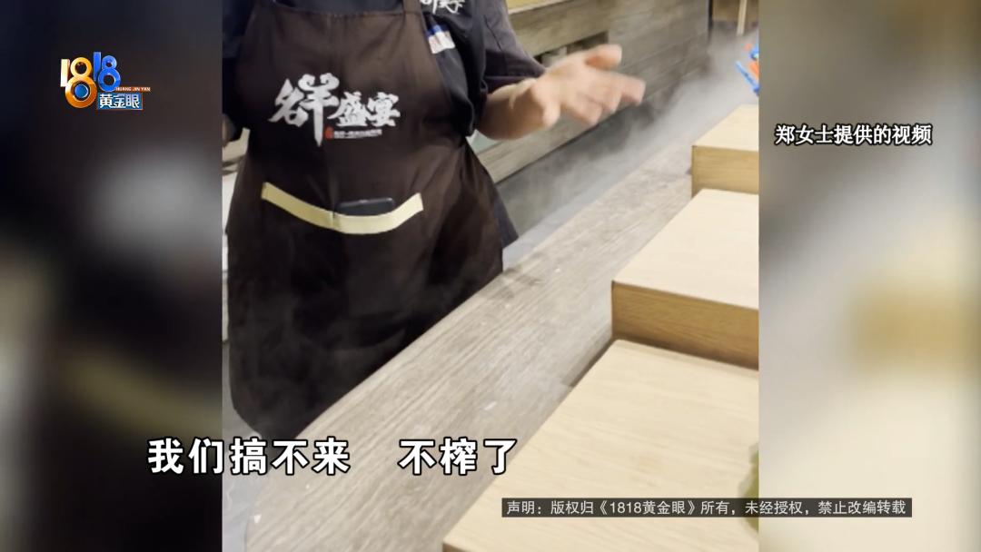 郑女士反映,9月25号她和婆婆吃了一顿自助火锅,结果她亲眼看到店家供应的西瓜汁是兑了自来水的。  郑女士说,当天她团购了两张 名羊天下火锅烧烤自助料理镇明路店的券,单价89元。晚上8点55分到店,当时婆媳两个人各接了一杯西瓜汁。  郑女士:后来我想再去打的时候,那里已经没有了。过了十几分钟我又去问她,你那个什么时候才会有?她说你过一会儿再来。  郑女士说,后来自己再去的时候西瓜汁还没有榨,她就又问了一遍服务员。  郑女士:就开始边切西瓜,边在那里骂我,这么晚来啊什么什么的。切完以后她放在一个不锈钢的盆子里面,打算去榨了。然后拿盆接自来水,加在一起再倒到榨汁机里面。那我就开始说了,我说你们就这样拿自来水给客人吃吗? 记者:您当时就站边上? 郑女士:我就站在边上看着她在那里榨。  这个过程郑女士并没有记录下来,她提供了事后录制的视频。  服务员:那个西瓜汁今天喝不上了,我们搞不来,不榨了。 郑女士:我现在也不要喝不喝得上,你拿生水在给我们喝,待会出问题了肯定要找你,我还是个孕妇呢。  郑女士说自己怀孕四个多月了,吃完火锅回去后她和婆婆都拉肚子了,郑女士还提供了一张照片,照片中枣子上粘着白色的东西。  郑女士:那时候我婆婆要去拿点冬枣,一看冬枣是发霉的,没有拿也没有吃了。 记者:那你现在的想法是啥呢? 郑女士:让他赔钱。我人都拉肚子了,再加上我也是个孕妇,然后还被她辱骂了,我心里很不舒服。 记者:赔钱? 郑女士:对,维权嘛对不对。 记者:西瓜汁兑自来水,你们不是没喝吗? 郑女士:我一开始已经喝了三四杯了。 记者:你说之前的那个? 郑女士:对,我已经喝了三四杯了。  找到店里,果汁摊位上没人,西瓜汁那格是空着的,店里一位易店长介绍了情况。  宁波名羊天下火锅烧烤自助料理镇明路店 易店长:到底有没有说我不知道,作为我们服务来说我想,她说的意思是什么呢?我们西瓜汁基本上夜宵是不卖的,夜宵没有了就没有了,就不榨了。另外这个人不是我们(常负责的员工),晚上可能不熟悉,确实跟顾客说的一样,把自来水接在西瓜里面榨汁。但是顾客看见这个情况,她也没有喝。  易店长说之前跟顾客沟通时,顾客的意思是之前喝的西瓜汁是不是也兑了自来水,关于这一点他跟顾客解释过了。 宁波名羊天下火锅烧烤自助料理镇明路店 易店长:西瓜汁严格来说适当加一点直饮水。她从来没榨过,客人要喝么,她心想榨一点,以前我们专门有定岗人员在做。 记者:当时负责榨果汁的人下班了? 宁波名羊天下火锅烧烤自助料理镇明路店 易店长:对。 记者:那冬枣呢? 宁波名羊天下火锅烧烤自助料理镇明路店 易店长:冬枣是这种情况,像这样子的,(有点坏了)它这个是皮。 郑女士:直接就发霉了。 记者:那你们后面有没有沟通过,怎么处理这个事? 宁波名羊天下火锅烧烤自助料理镇明路店 易店长:当时遇到这种情况,作为我们商家来说,尽量满足客户的需求吧,当时把她单免了。不同意,她要我们赔付一千块钱。  易店长说,郑女士后来投诉到了市场监管部门,店里也接到了市场监管的电话。他希望后续事情的处理交给相关部门。 来源:1818黄金眼