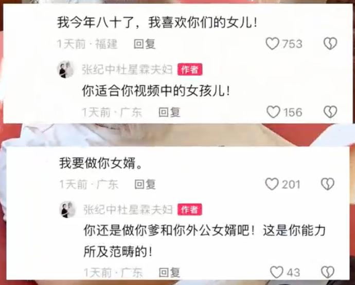 近日,知名导演、制片人张纪中发视频庆祝女儿一岁生日,但不少网友在评论区留言“求娶”,相关留言随后被张纪中怒怼。  其中有网友表示“我要做你女婿”,张纪中回应“你还是做你爹和你外公女婿吧”,网友称其妻子为“丈母娘”,张纪中怒怼“你外婆是你丈母娘”。   公开资料显示,张纪中出生于1951年5月,系国内知名导演、制片人,曾翻拍过许多金庸先生的经典小说,曾担任《笑傲江湖》《天龙八部》《神雕侠侣》《射雕英雄传》等制片人。 张纪中的现任妻子杜星霖出生于1982年,是其第三任妻子,婚前曾是他的助理。2024年10月,杜星霖为张纪中生下两人第四个孩子。  潇湘晨报综合