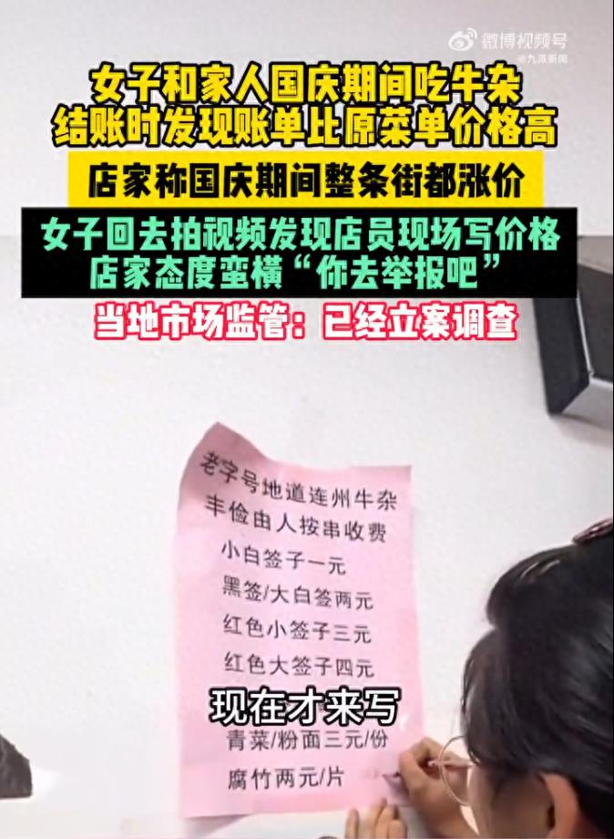 经核查,该牛杂店经营场所内有公示商品销售价目表,但未提前告知消费者国庆节期间价格上涨的情况。 10月4日,该消费者到店消费时,该牛杂店经营者按其公示价目表每串加收一元的标准进行结算,结算金额为203元,该行为违反了《中华人民共和国价格法》有关条款规定。目前我局已责令其退回该消费者多付的价款50元,并处以罚款3500元的行政处罚。 来源:九派新闻、广东连州市市场监督管理局