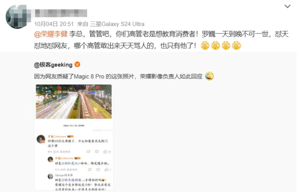 原华为终端首席相机总工程师罗巍,在加入荣耀之后频频引发争议。 此前,他就曾因为内涵华为Pura80的“一镜双目”设计华而不实、怒怼vivo影像技术涉嫌抄袭而受到关注。这一次,他又因为荣耀Magic8 Pro拍摄的夜景照片受到差评而直接公开辱骂网友,被质疑言论不当,甚至有网友喊话荣耀CEO李健出面管一管。针对此事,荣耀方面暂无说法。 今年初经历人事大变革的荣耀,目前正处于走出销量低谷的关键期。在跌出中国前五之下,荣耀此前提出了要在今年年底重返国内前三的目标,而即将发布的荣耀Magic8系列的表现无疑十分关键。 网友质疑照片质量遭高管辱骂 荣耀首席影像工程师@罗巍Cyberverse 近日再次引发争议,这次是因为在微博上公开辱骂网友。 事件源于10月3日,罗巍发布了多张荣耀Magic8 Pro拍摄的夜景照片,并且重点介绍了15秒手持流光快门的照片,展示防抖能力。不过,不少网友并不买账,认为这张照片没有拍好。  面对着网友的批评,罗巍开启了怒怼模式,直接辱骂网友,他表示:“好像SB们又沸腾了,不太知道流光快门这个事。”网友们认为,身为荣耀首席影像工程师,如此发言非常不合适,还有网友喊话荣耀CEO李健要管一管。  10月6日晚间,罗巍在微博发文疑似回应此事,他表示:“我在网上骂的是啥……不知道现在有些人咋回事,都挣当啥……我觉得还挺有意思的,注意是挣,不是争 。”他还在评论区补充称,“挣的意思应该是收钱了,不然为啥这么前仆后继,奋勇争先”。言外之意是自己遭遇了水军攻击。  资料显示,罗巍于2012年加入华为,历任终端首席相机总工程师、Cyberverse总工程师。他组建华为影像团队,主导研发了荣耀6 Plus、华为P9系列、华为P20/P30系列等产品。2024年5月,罗巍加入荣耀后担任首席影像工程师。 在荣耀任职期间,他的多次言论引发争议。他曾提出目标,表示荣耀有影像的三年之约,三年后友商看不到荣耀尾灯,或者甩下一条街。在微博上,他也频频发声,嘲讽vivo,甚至是前东家华为。 今年7月,华为Pura 80 Ultra的一镜双目设计获得不少关注。罗巍在聊到关于荣耀手机也将会配备一镜双目的爆料消息时,明确称这些都没有,并且表示“不会盲目堆砌硬件,更加不会在华而不实的设计上浪费时间。”这被外界解读为是在内涵华为的一镜双目设计华而不实。 今年9月,他更是直接公开点名怒怼vivo。当时,vivo在影像技术发布会上预告,10月即将发布的vivo X300系列,将在多个影像技术上实现升级。但vivo关于影像技术的一些命名和营销上引发了罗巍的不满。 他晒出vivo影像技术发布会截图以及vivo高管的微博发言截图,并表示:“这么快就成了行业标杆了吗?刚叫了大小王现在来蹭Magic,还加了云端增强。录中美拍,这个荣耀2022年Magic4就发布了,而且也叫录中美拍。现在大家懒得名字都不改了?看来律师要忙了,这个我们有好多专利啊。” 重返国内市场前三能否实现? 值得注意的是,罗巍此次陷入舆论争议,正值荣耀最新旗舰手机荣耀Magic8系列发布前夕。 今年9月9日,荣耀CEO李健宣布该系列将配备2亿像素长焦镜头,并采用大模型技术实现软硬件系统更新。9月25日,荣耀产品线总裁方飞在骁龙峰会中国专场上宣布,该系列新机将首批搭载高通第五代骁龙8至尊版移动平台。 而荣耀Magic8 Pro拍摄的夜景照片翻车,以及罗巍此次的辱骂网友舆论风波,或许将对该产品的发售带来一定的不利影响。 当前,荣耀正在处于调整关键期,要走出今年初以来的销量低谷。荣耀公司销售与服务总裁王班此前在接受媒体采访时提出市场目标:“希望荣耀手机在今年年底的时候,能够重返国内市场前三。”  根据调研机构CounterPoint Research发布的最新报告,今年第二季度中国智能手机市场出货量前五名分别为华为、vivo、OPPO、小米和苹果,而荣耀则排名第六,出货量同比下降19%。这意味着荣耀要在今年重返国内市场前三,仍需努力。 为了走出低谷,荣耀也在多方面进行了调整与变革。 今年4月初,荣耀在内部启动“雄鹰计划”,对中国区销售与服务等部门人员进行调整,38个关键岗位主管“重新竞聘上岗”;今年5月底,荣新CEO李健宣布启动“全球百万雄鹰计划”,面向全球招募10名技术领军人才、100名销售精英、1000名优秀毕业生及1万名荣耀用户体验官,并分别将其命名为“擎鹰”“战鹰”“雏鹰”“耀鹰”。 今年初对外发布“阿尔法战略”后,荣耀新成立了5个一级部门,包括新产业孵化部、新商业模式拓展部、消费者洞察与体验部、品牌部。其中新产业孵化部进军了机器人赛道。 在手机产品方面,荣耀今年已经推出了荣耀Power、荣耀GT Pro、荣耀400系列、荣耀Magic V5等产品。作为直板旗舰的荣耀Magic8系列,对于荣耀今年下半年的市场表现也十分重要。其能否助力荣耀在今年年底重返国内前三?我们拭目以待。 来源:新浪财经