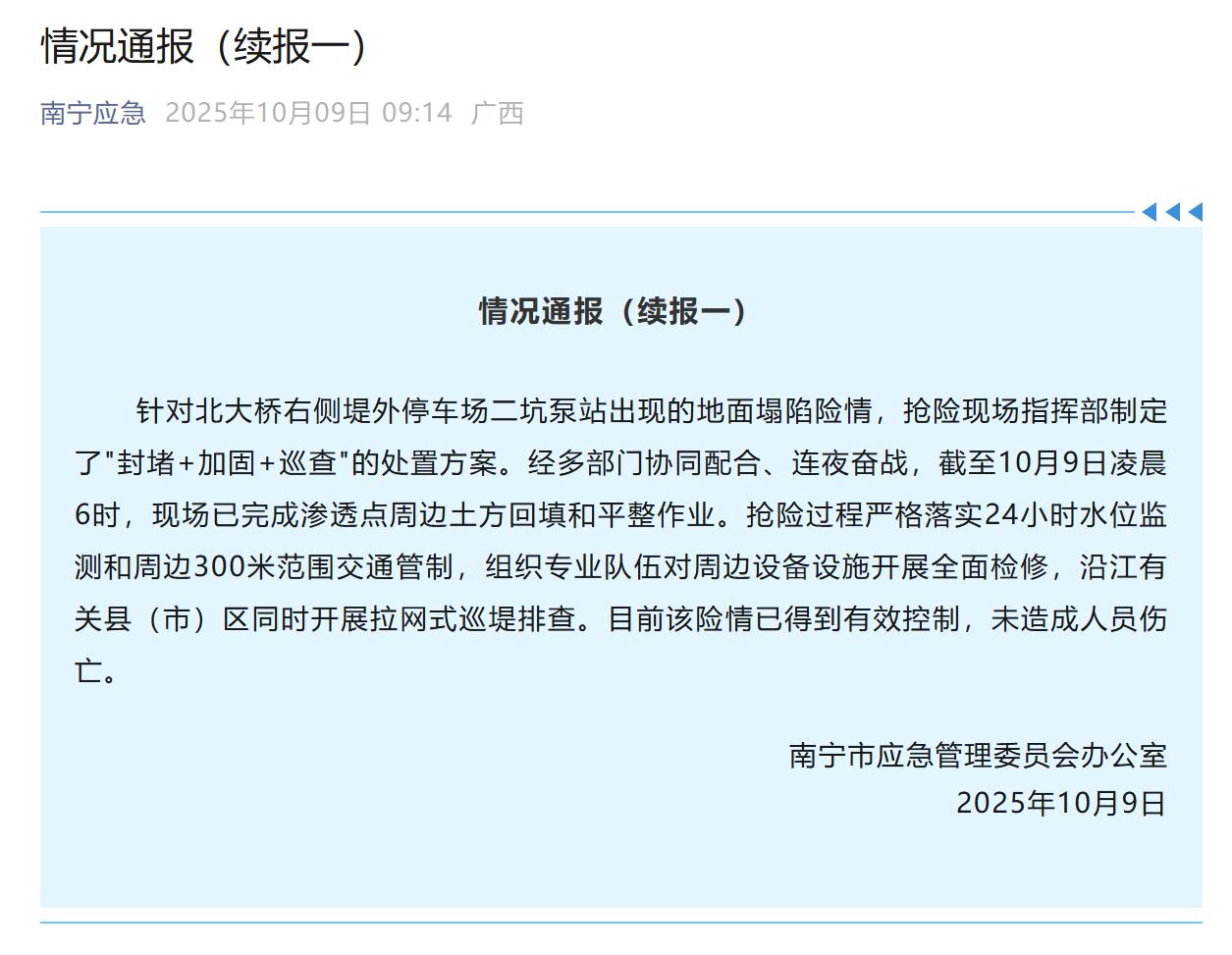 △通报及续报 2025年10月8日19时50分,南宁市应急指挥部通过监控发现:南宁市北大桥右侧堤外停车场二坑泵站有一陷坑。发现险情后,市应急指挥部立即报告并调度中国安能一局等抢险力量赶赴现场处置。目前,抢险现场已成立临时指挥部,并组织水利专家会商抢险处置方案。现场已采取临时交通管制、临时停电、群众转移等安全保障措施,紧急调度混凝土等应急物资抓紧开展抢修处置工作。同时,要求沿江相关城区继续开展全线巡堤工作,一旦发现险情立即报告并及时处置。后续有关情况将进一步发布。 针对北大桥右侧堤外停车场二坑泵站出现的地面塌陷险情,抢险现场指挥部制定了"封堵+加固+巡查"的处置方案。经多部门协同配合、连夜奋战,截至10月9日凌晨6时,现场已完成渗透点周边土方回填和平整作业。抢险过程严格落实24小时水位监测和周边300米范围交通管制,组织专业队伍对周边设备设施开展全面检修,沿江有关县(市)区同时开展拉网式巡堤排查。目前该险情已得到有效控制,未造成人员伤亡。 来源:潇湘晨报记者曾永红