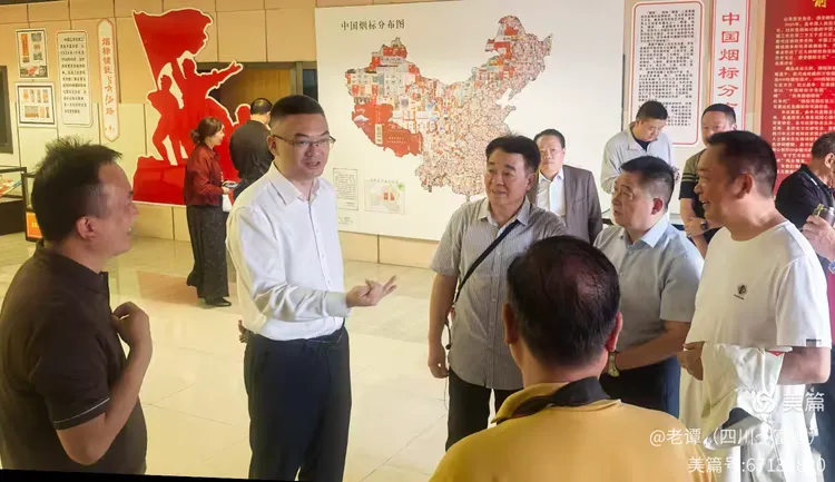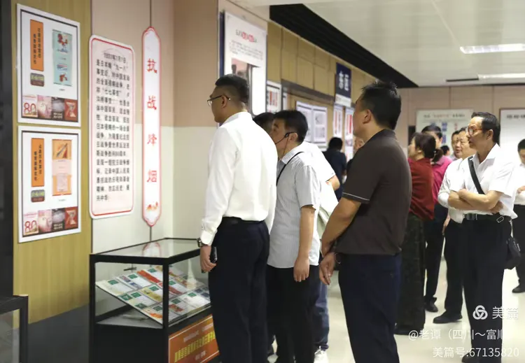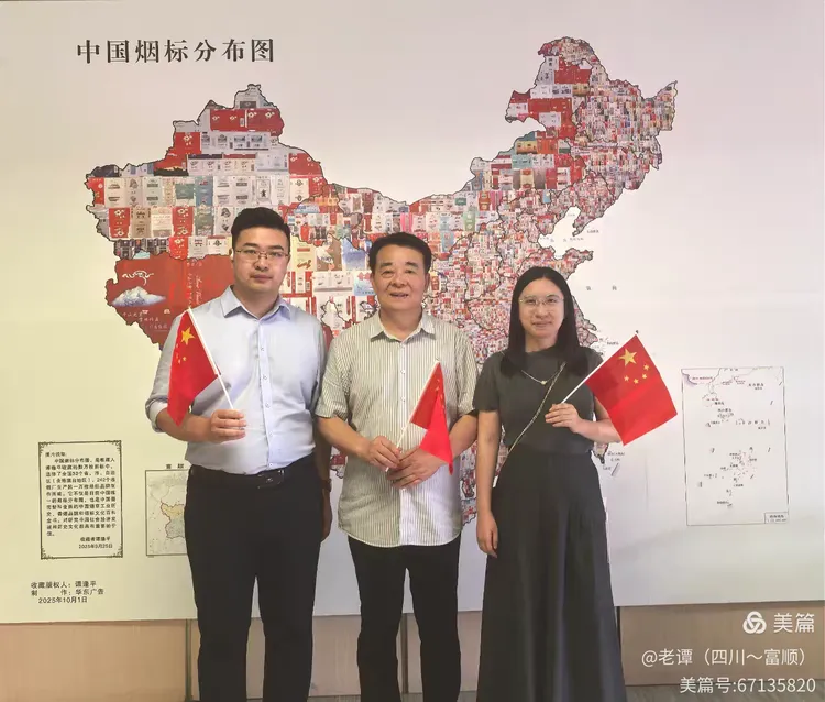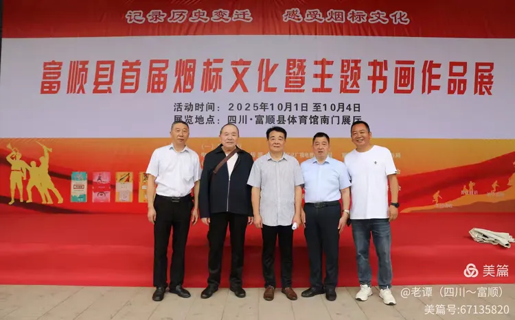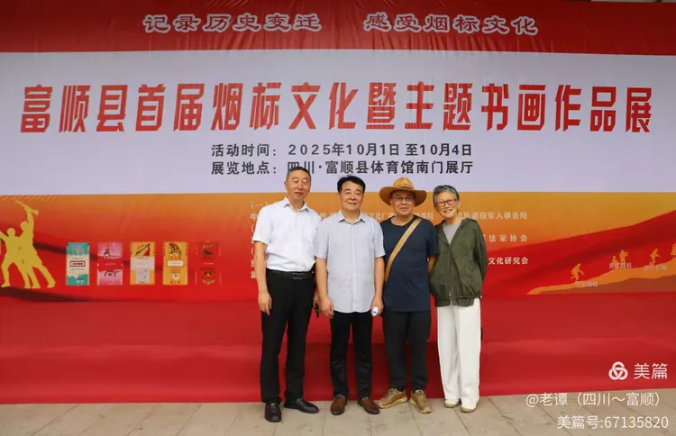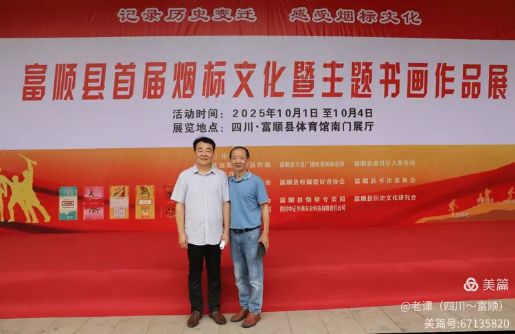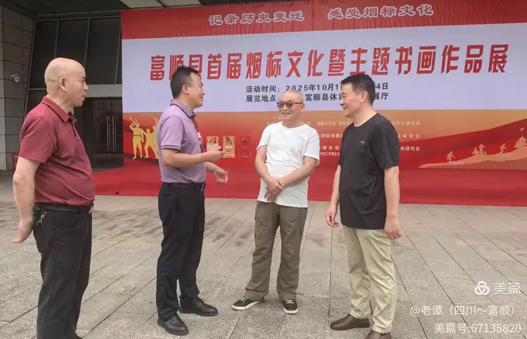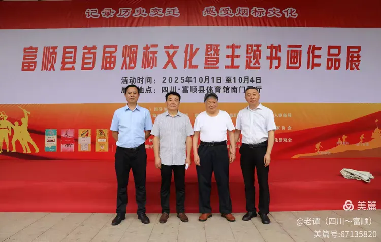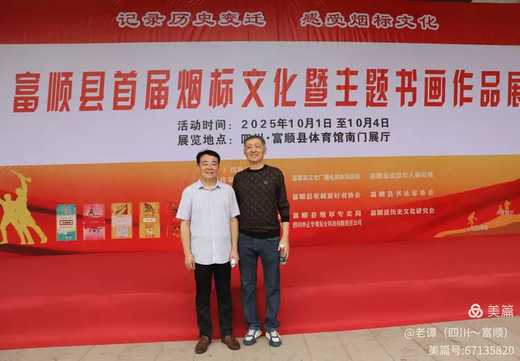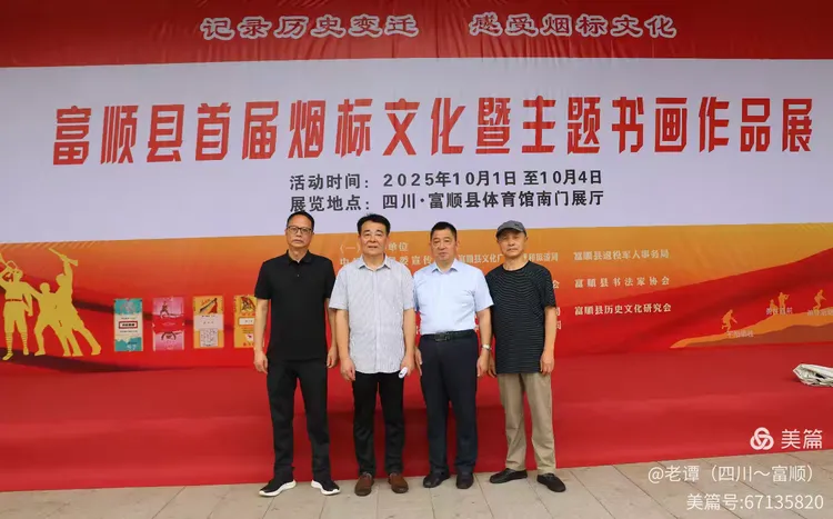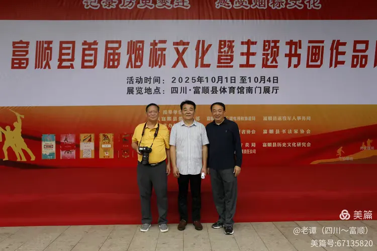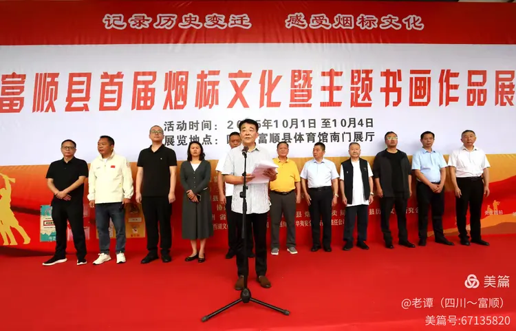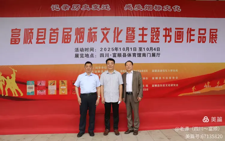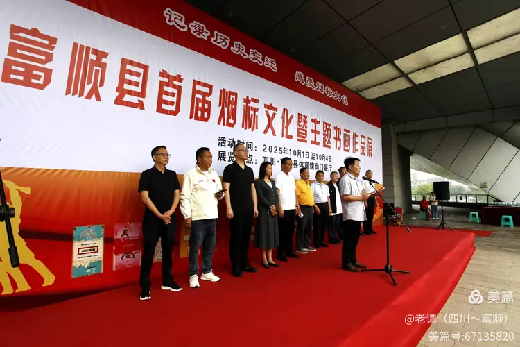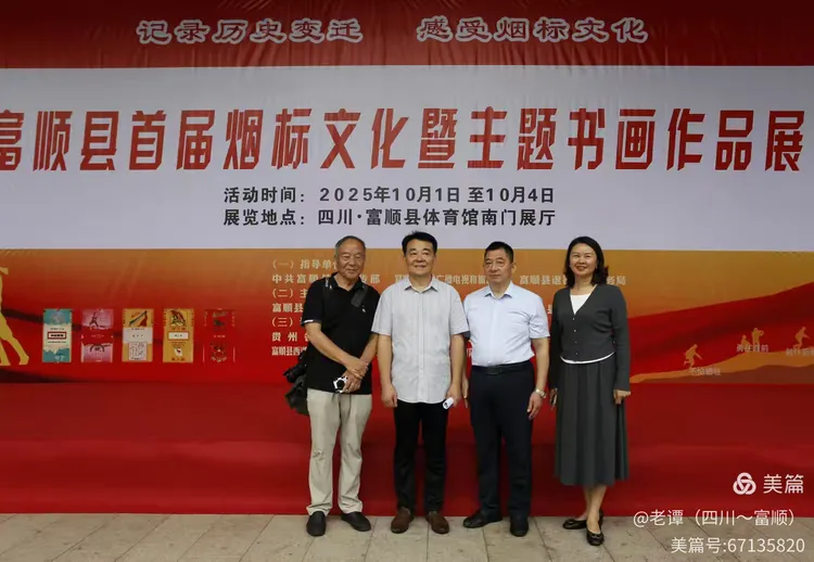 2025年10月1日上午10时,中共富顺县委书记刘军及相关部门负责人,在烟标收藏人谭逢平的讲解下,参观“记录历史变迁,感受烟标文化“——富顺县首届烟标文化暨主题书画作品展。从展览“前言”、“中国烟标分布图”、“烟标铺就长征路”、“抗战烽烟”、“抗美援朝烟标”、“经济牌”香烟的前世今生、“火红年代”、“烟标上的红色文化”、“主题书画作品展”八个专栏,全程仔细观展,还经常与大家互动交流。