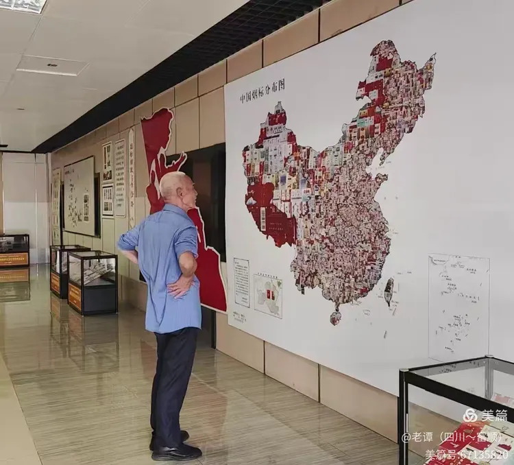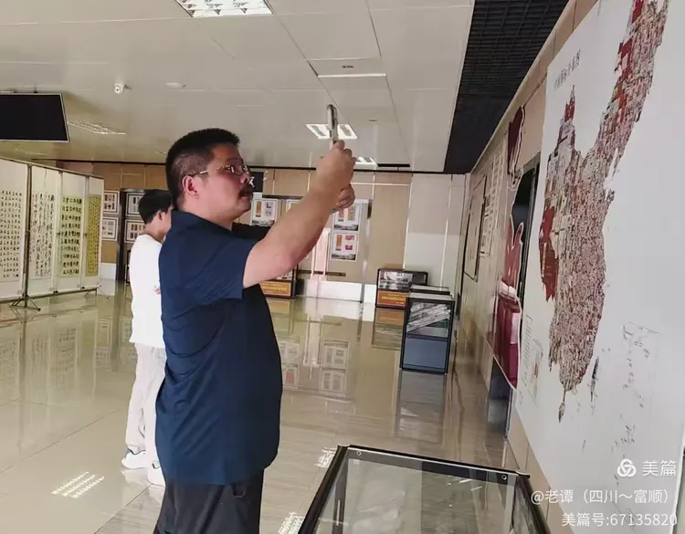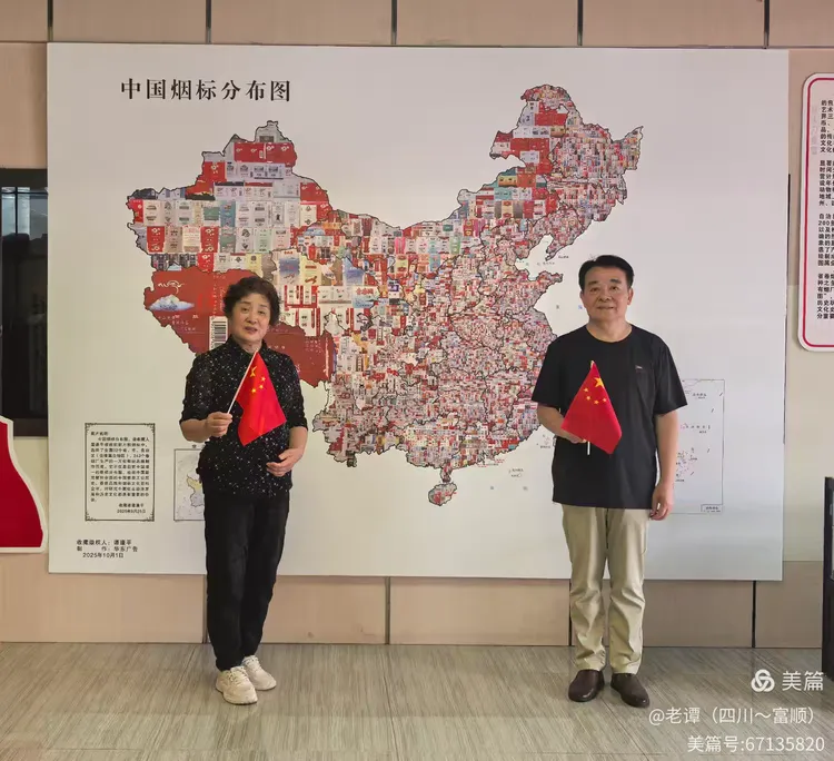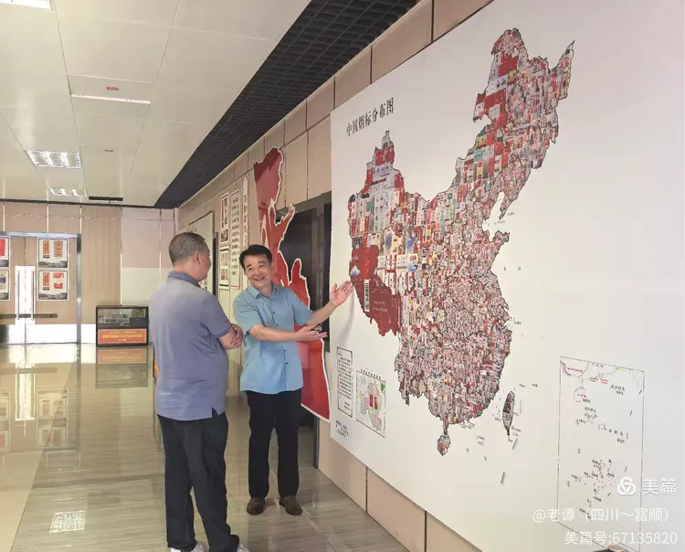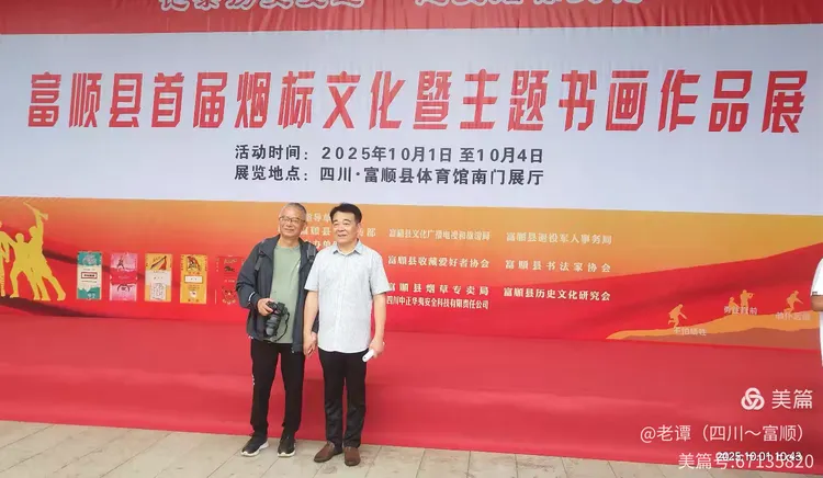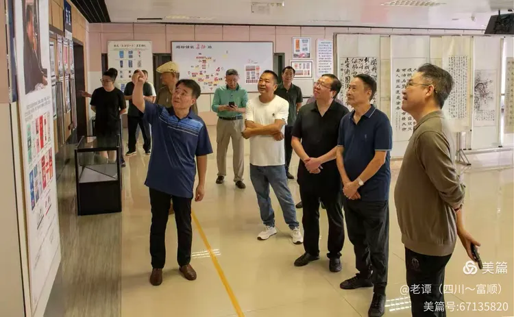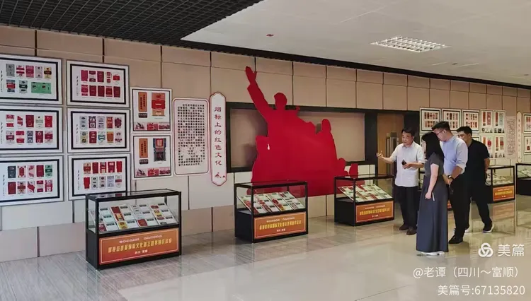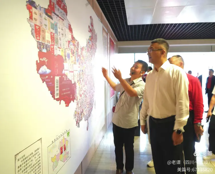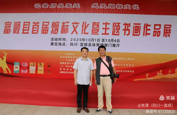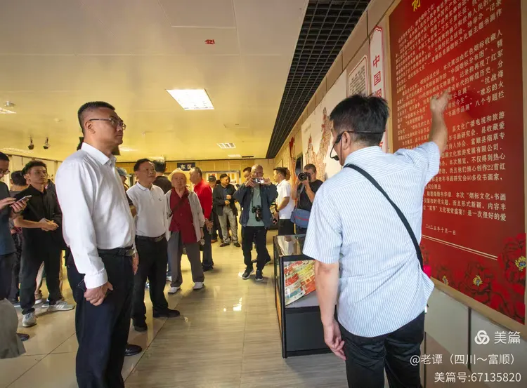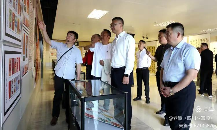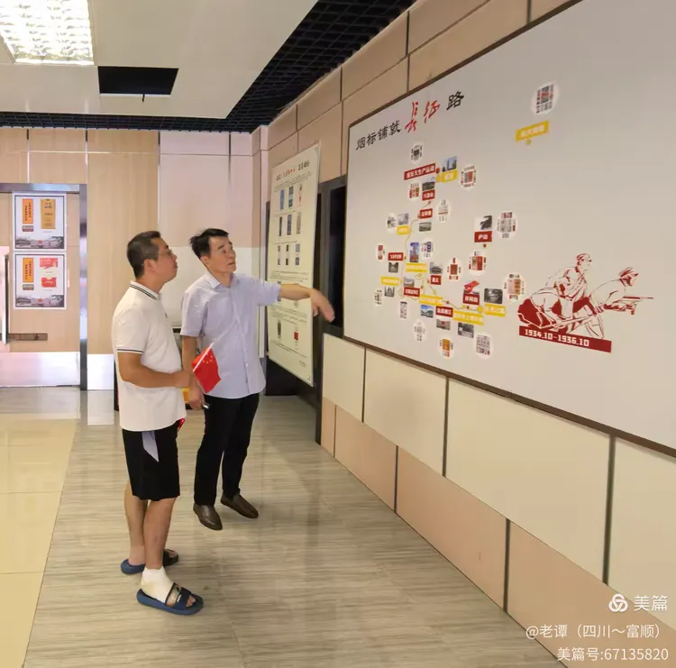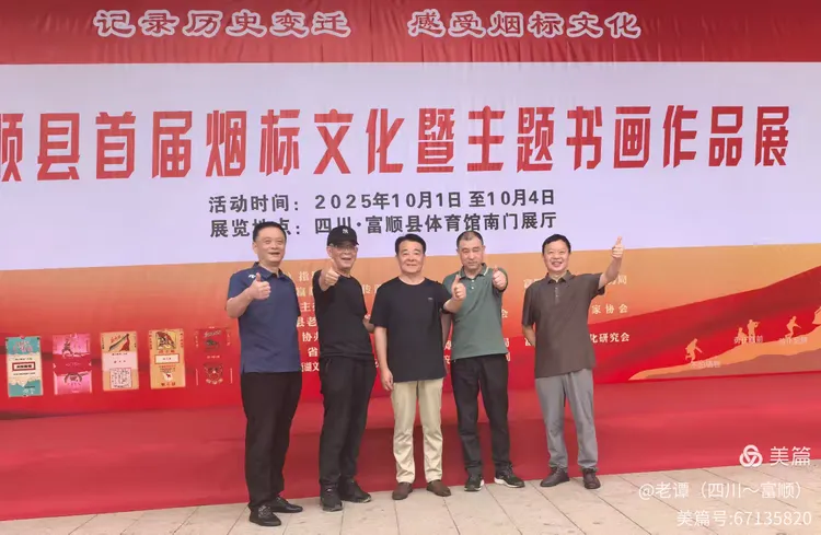 2025年10月1日上午10时,中共富顺县委书记刘军及相关部门负责人,在烟标收藏人谭逢平的讲解下,参观“记录历史变迁,感受烟标文化“——富顺县首届烟标文化暨主题书画作品展。从展览“前言”、“中国烟标分布图”、“烟标铺就长征路”、“抗战烽烟”、“抗美援朝烟标”、“经济牌”香烟的前世今生、“火红年代”、“烟标上的红色文化”、“主题书画作品展”八个专栏,全程仔细观展,还经常与大家互动交流。