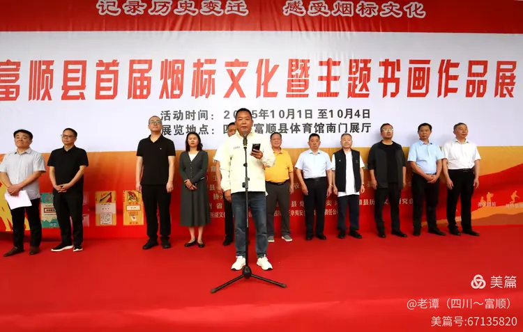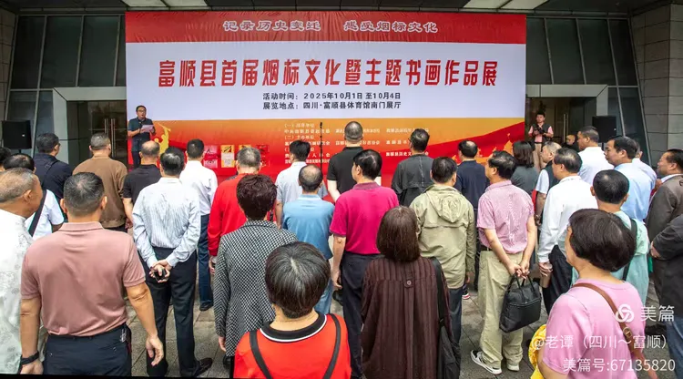 2025年10月1日至4日,记录历史变迁,感受烟标文化——富顺县首届烟标文化暨主题书画作品展,在富顺县体育馆举行。 10月1日上午,举行了隆重的开幕式。指导单位负责人,县文化广播电视和旅游局副局长黄勇主持开幕式。县委宣传部副部长严玉、县退役军人事务局副局长李家铀、县烟草专卖局副局长杨帆;主办单位负责人,县老年书画研究会长谭逢平、县收藏爱好者协会会长陈永兴、县书协主席伍平;特邀嘉宾,贵州省诗人协会名誉会长耕夫、四川中正华夷安全科技公司董事长刘谦;协办单位负责人,县历史文化研究会会长何安平等出席开幕式。