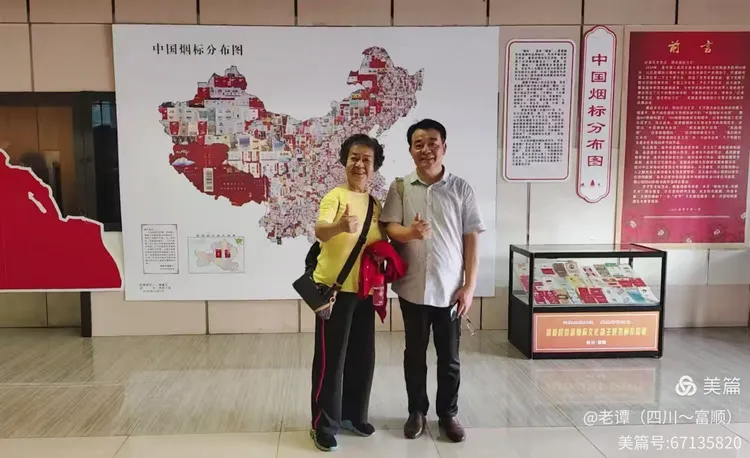 雍先生夫妻与收藏人谭逢平在“中国烟标分布图”合影。