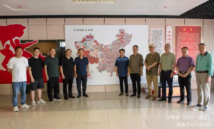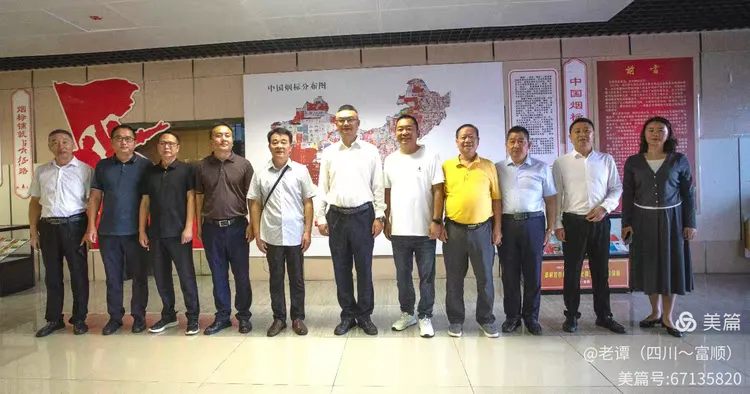 自贡市大安区政协主席关义彬、富顺县政协原主席胡晓波、县委组织部副部长贺君涛、县委宣传部副部长肖体刚、东湖街道办主任彭万松、四川江阳磁材公司总经理何洪波、成都红色旅游公司董事长祁先生、四川中正华夷安全科技公司董事长刘谦、烟标收藏爱好者潘用贵等观展后,在“中国烟标分布图”前合影留念。