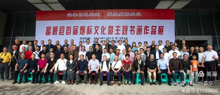 出席“记录历史变迁,感受烟标文化“——富顺县首届烟标文化暨主题书画作品展的指导、主办、协办单位负责人、特邀嘉宾和全体会员100余人合影留念。
