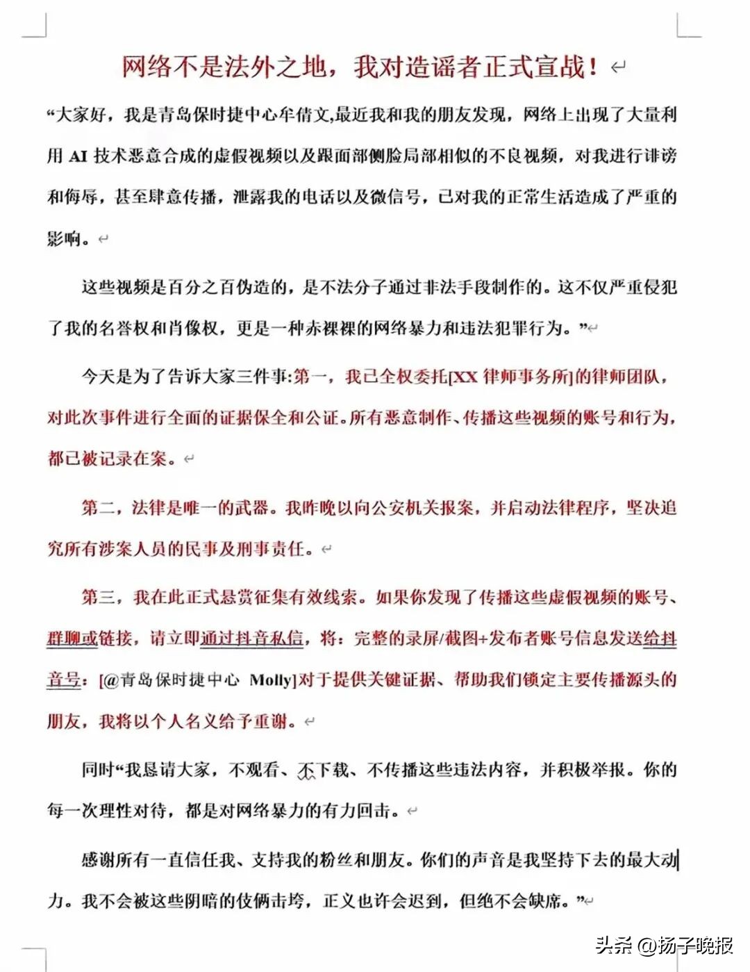 10日,牟女士通过社交媒体公布了自己在派出所处理相关事宜的照片,配文称:网络上出现大量利用AI技术恶意合成的虚假视频以及跟面部侧脸局部相似的不良视频,对她进行诽谤和侮辱,甚至肆意传播,泄露她的电话以及微信号,已对正常生活造成了严重的影响。 文中称,这些视频是百分之百伪造的,由不法分子通过非法手段制作。她已委托律师团队,对此次事件进行证据保全和公证。  发文截图 图源:牟女士社媒
